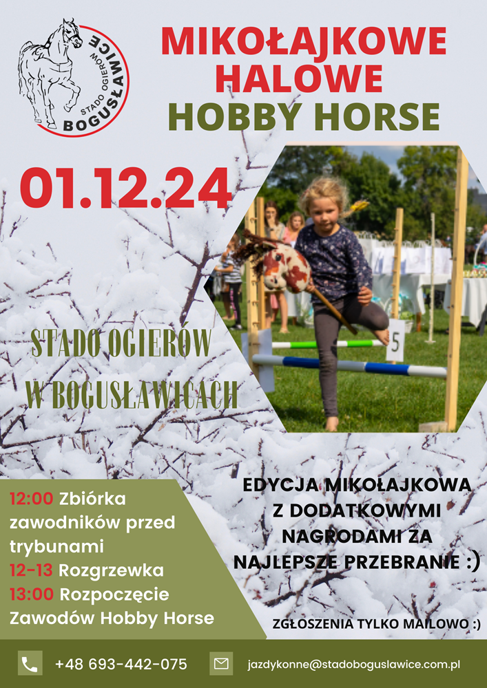 W niedzielę 1 grudnia rozegrany zostanie konkurs dla Dzieci – Zawody Hobby Horse przeznaczone dla dzieci i młodzieży w wieku od 4 do 16 lat. Zawodnik by ukończyć konkurs musi pokonać tor przeszkód (parkur) w odpowiedniej kolejności od linii startu do linii mety. W trakcie przejazdu zawodnik musi trzymać Hobby Horse między udami i co najmniej w jednej ręce.