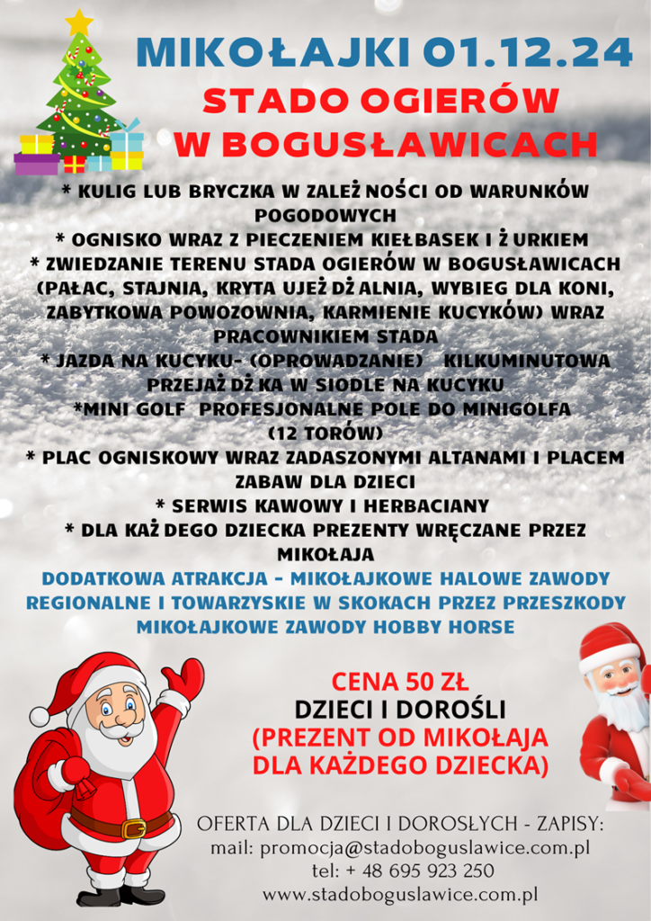 Dodatkową niedzielną atrakcją będą Mikołajki 2024 możliwość przejazdu bryczką (piknik wagon) po terenie Stada, zwiedzanie obiektu wraz z przewodnikiem, ognisko wraz z kiełbaskami i żurkiem, minigolf, gry i zabawy sportowe, oprowadzanie na kucyku oraz spotkanie z Mikołajem, na którym dzieci otrzymają prezenty.