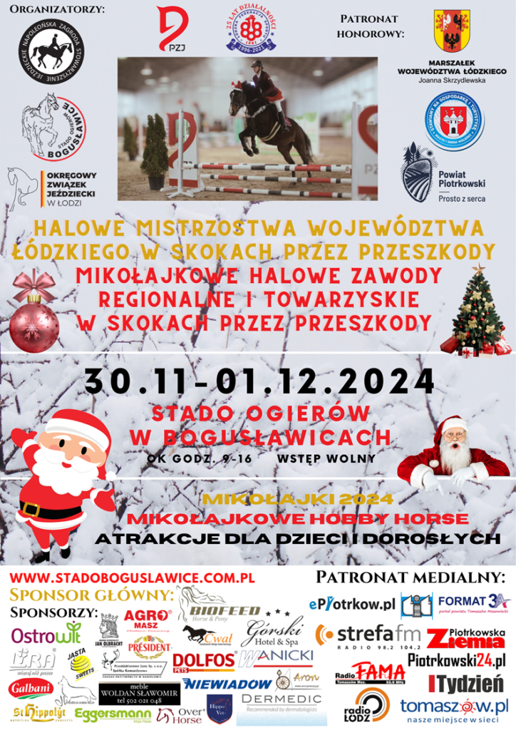 Stado Ogierów w Bogusławicach zaprasza w najbliższą sobotę i niedzielę (30.11-01.12) na Halowe Mistrzostwa Województwa Łódzkiego w Skokach przez Przeszkody. Mikołajkowe Halowe Zawody Regionalne i Towarzyskie w Skokach przez Przeszkody.
