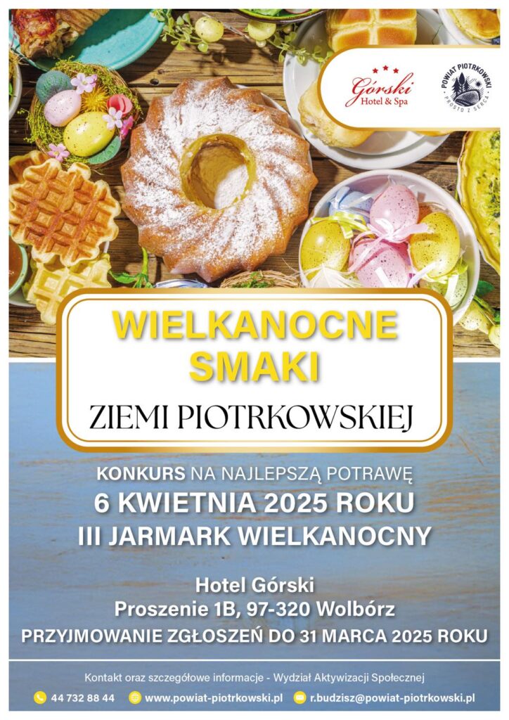 Wystawcy mogą przesłać kartę zgłoszeniową do 31 marca 2025 roku na adres r.budzisz@powiat-piotrkowski.pl lub dostarczyć ją osobiście do Starostwa Powiatowego w Piotrkowie Trybunalskim. Uczestnicy przygotowują stoły wielkanocne z tradycyjnymi potrawami. Komisja oceni smak, kreatywność i estetykę prezentacji. Na zwycięzców czekają nagrody, a każdy uczestnik konkursu otrzyma upominek. Nie przegap tej okazji, by poczuć smak tradycji i przygotować się do świąt w wyjątkowej atmosferze. Do zobaczenia na Jarmarku!