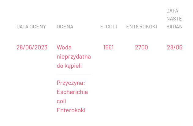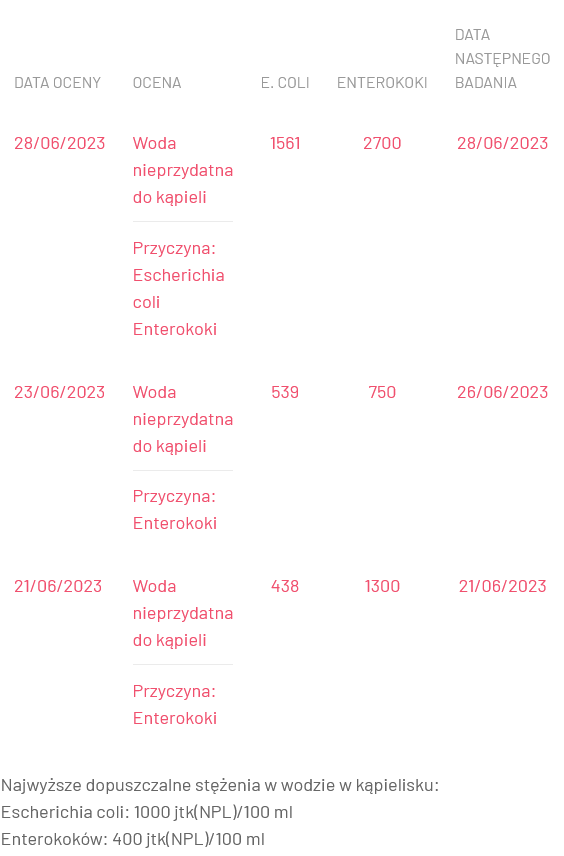 Poprzednie badania wyglądały nieco lepiej, chociaż także normy były przekroczone: e.coli – 539 a enterokoki – 750 (badanie z 23.06) oraz odpowiednio: 438 i 1300 (badanie z 21.06).
