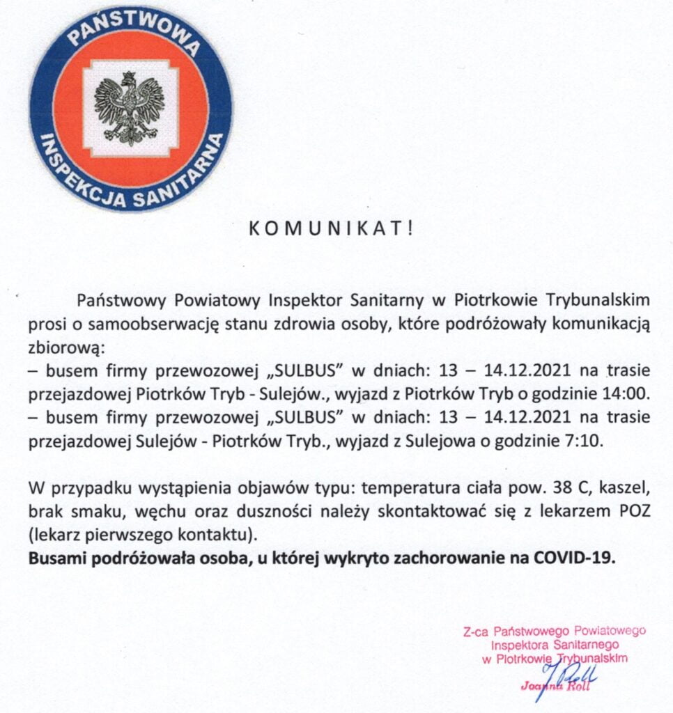 Państwowy Powiatowy Inspektor Sanitarny w Piotrkowie Trybunalskim prosi o samoobserwację stanu zdrowia osoby, które podróżowały komunikacją zbiorową: