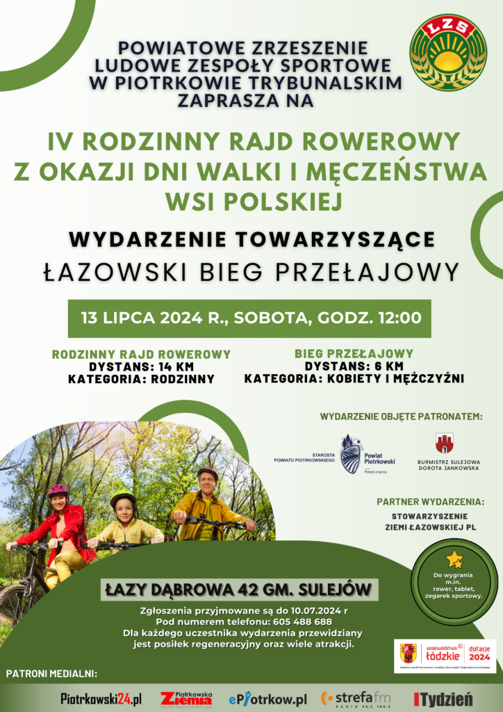 12 lipca obchodzony będzie Dzień Walki i Męczeństwa Wsi Polskiej, który ma na celu uczczenie pamięci bohaterów – mieszkańców polskiej wsi, którzy heroicznie nieśli pomoc potrzebującym w czasach II wojny światowej. Z tej okazji, dzień później, 13 lipca, odbędzie się IV Łazowski Rodzinny Rajd Rowerowy organizowane przez Stowarzyszenie Ziemi Łazowskiej. Do udziału w wydarzeniu zapraszają Starosta Powiatu Piotrkowskiego Piotr Łączny oraz burmistrz Sulejowa Dorota Jankowska, którzy objęli wydarzenie patronatem. Zgłoszenia przyjmowane są do 10 lipca, pod numerem telefonu 605 488 688.