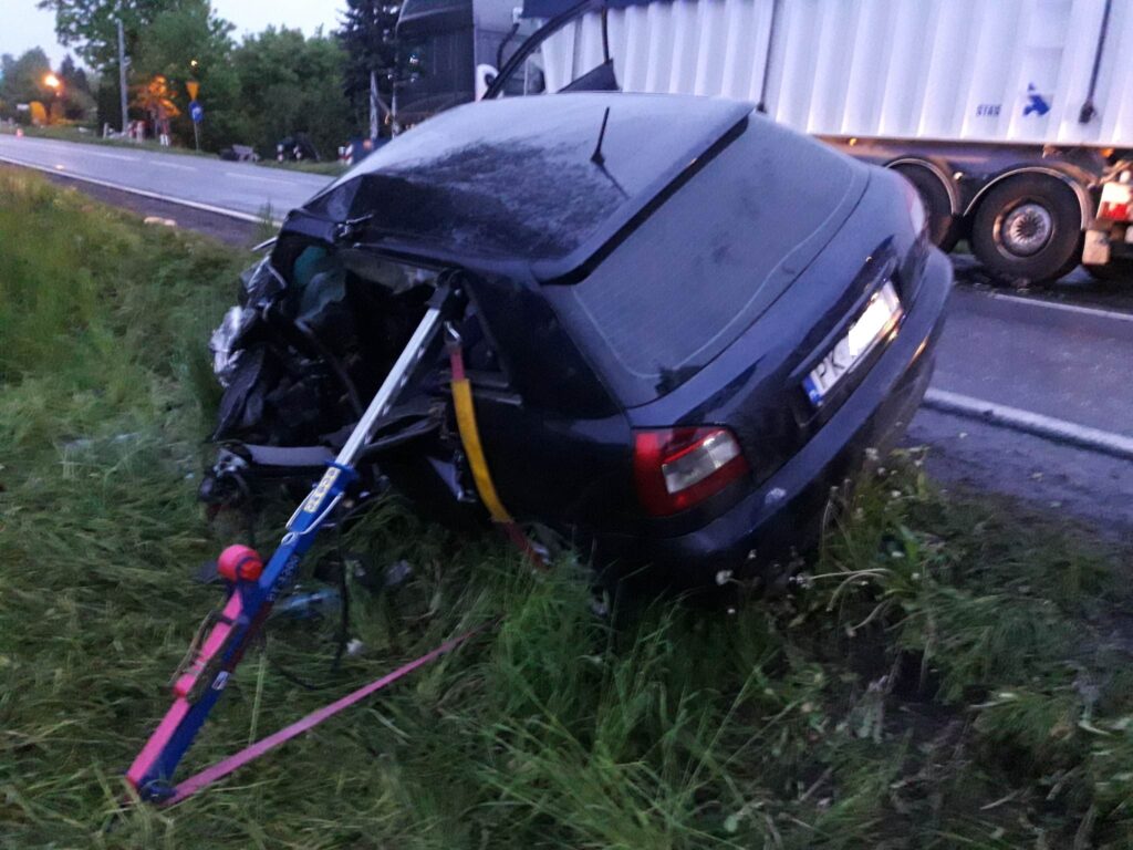 Przed godziną 20-tą doszło do zdarzenia drogowego z udziałem pojazdu ciężarowego oraz osobowego. Ze wstępnych ustaleń policjantów będących na miejscu wynika, że kierujący audi jadąc w kierunku Piotrkowa, w wyniku nieprawidłowej obserwacji drogi, zjechał na przeciwległy pas ruchu i doprowadził do zderzenia z prawidłowo jadącym pojazdem ciężarowym marki daf – mówi mówi asp. sztab. Izabela Gajewska rzeczniczka piotrkowskiej policji. – W wyniku poniesionych obrażeń kierowca osobówki został przewieziony do szpitala w Piotrkowie. Obaj uczestnicy byli trzeźwi. Na miejscu policjanci wykonują wszystkie czynności by ustalić dokładny przebieg zdarzenia. Utrudnienia w tym miejscu mogą potrwać do około 21:30. Samochody osobowe kierowane są objazdem przez miejscowość Koło – dodaje.