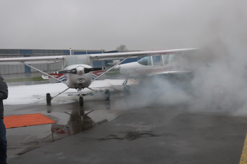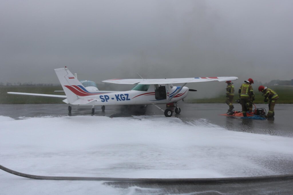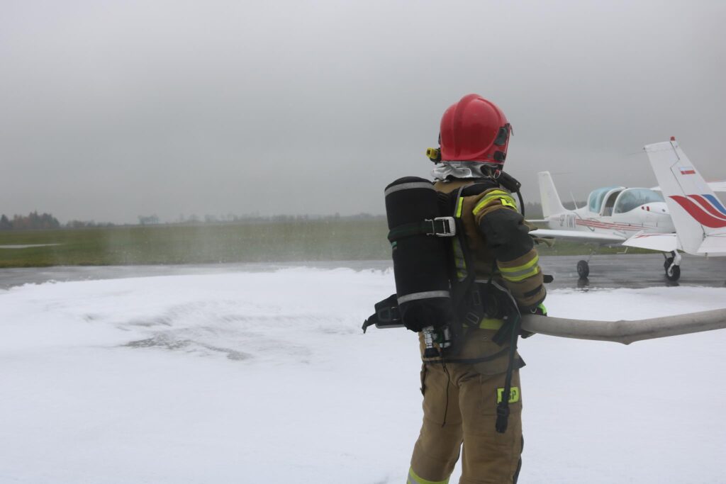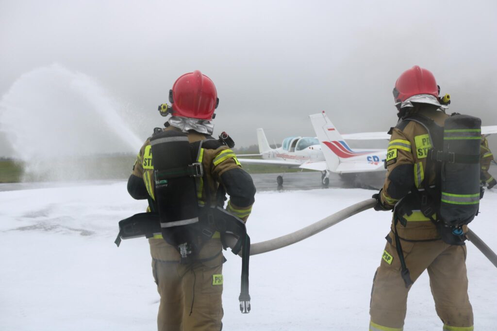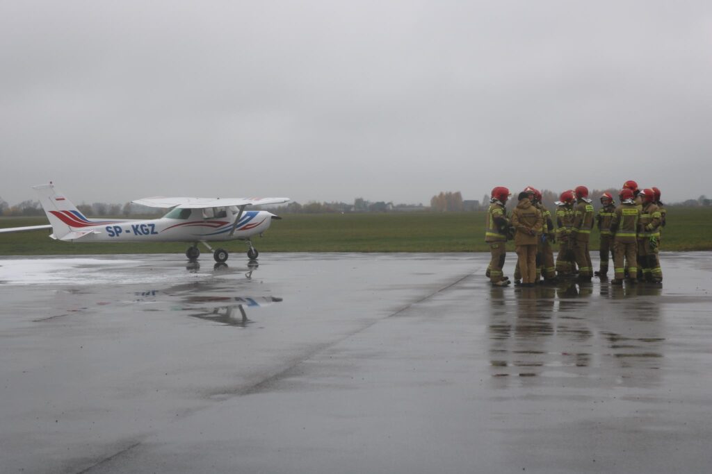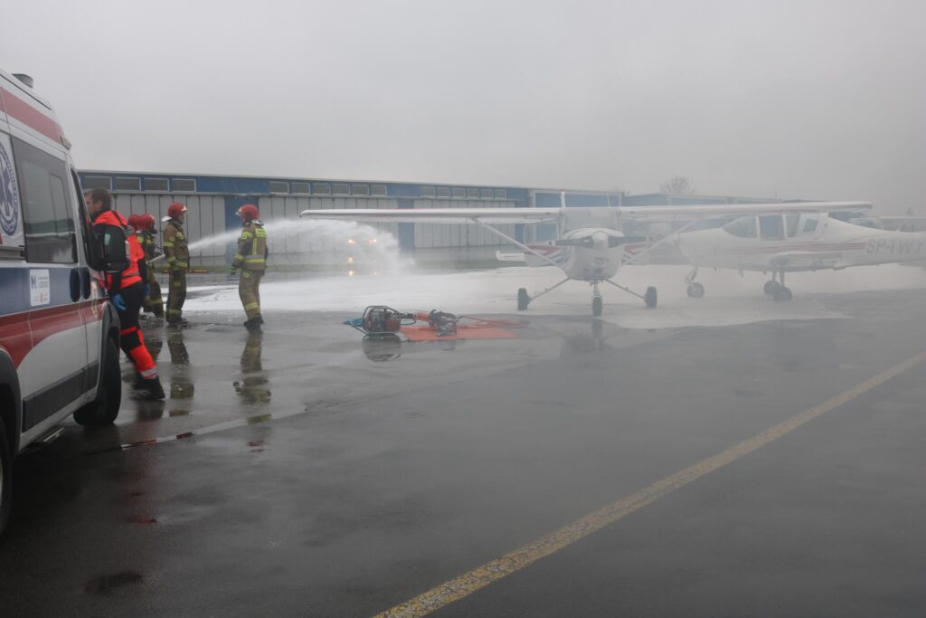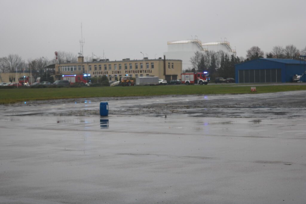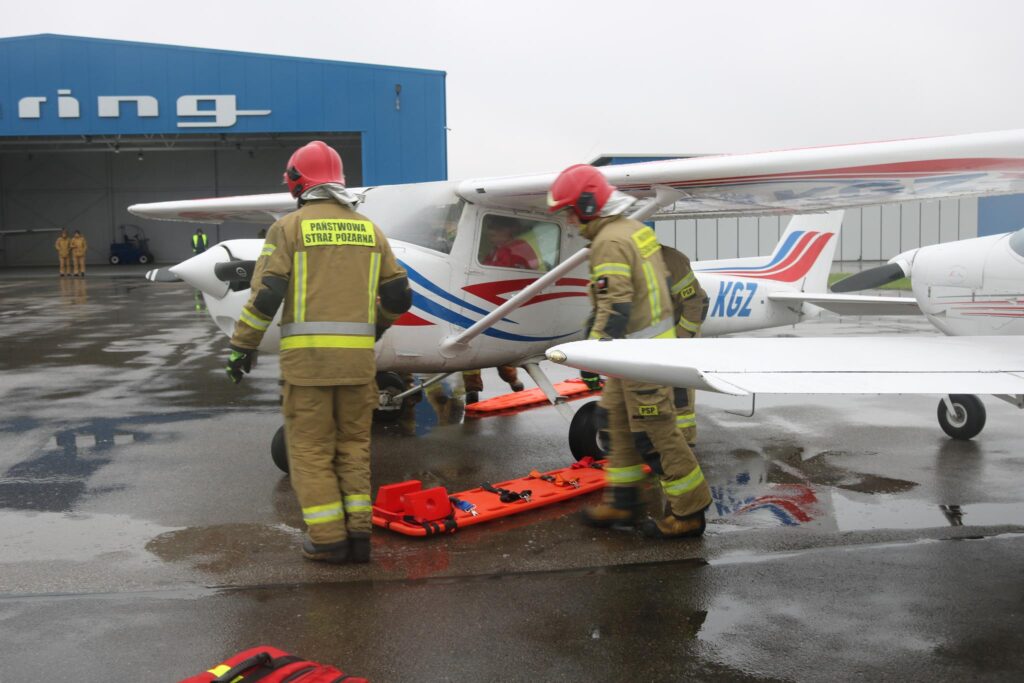 Mały samolot z jedną osobą na pokładzie kołuje do progu pasa, w tym samym czasie do lotniska zbliża się kolejna awionetka z dwiema osobami na pokładzie, która z powodu awarii silnika i niskiej wysokości, musi wykonać awaryjne lądowanie. Samolot nie zdołał dolecieć do pasa i uderza w kołujący drugi statek powietrzny. Oba samoloty z osobami na pokładzie ulegają uszkodzeniu, a znajdujący się w nich piloci odnieśli różnego typu obrażenia – to scenariusz dzisiejszych ćwiczeń, które odbywały się na lotnisku w Piotrkowie.