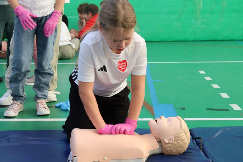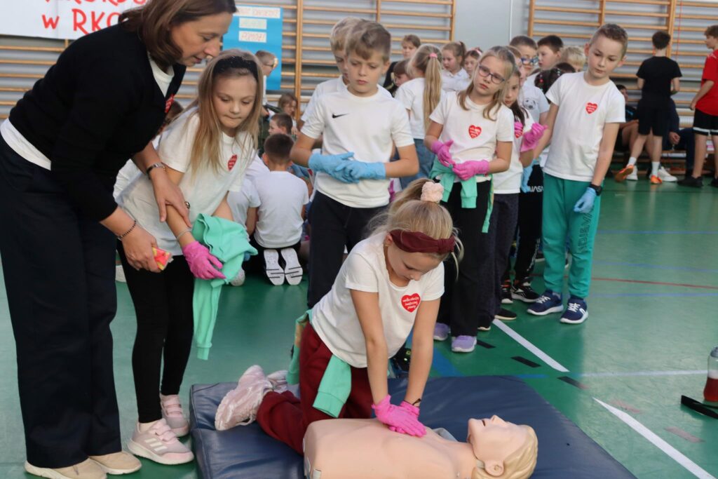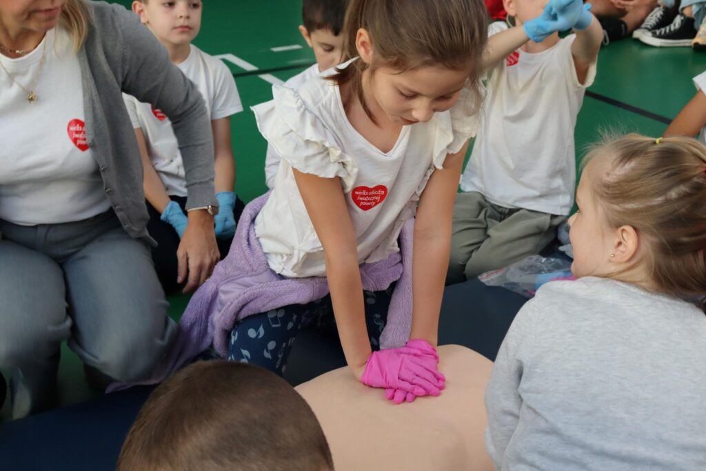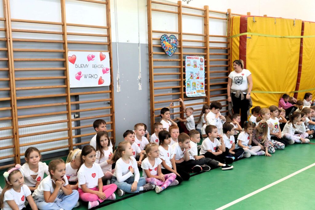 – W akcji uczestniczyli najmłodsi uczniowie naszej szkoły z klas: 1a, 1b, 1c, 1d, 2b, 2c, 2d, i 2e z wychowawcami oraz klasy 5e i 6c, łącznie 238 uczniów. Przez 30 min od godz. 12.00 do godz. 12.30 prowadzona była nieprzerwanie RKO metodą samych uciśnięć klatki piersiowej, tj. bez wdechów, ale zgodnie z regulaminem, każdy uczestnik miał możliwość wykonywania uciśnięć przez 1 minutę – dodaje Marta Szafranek.