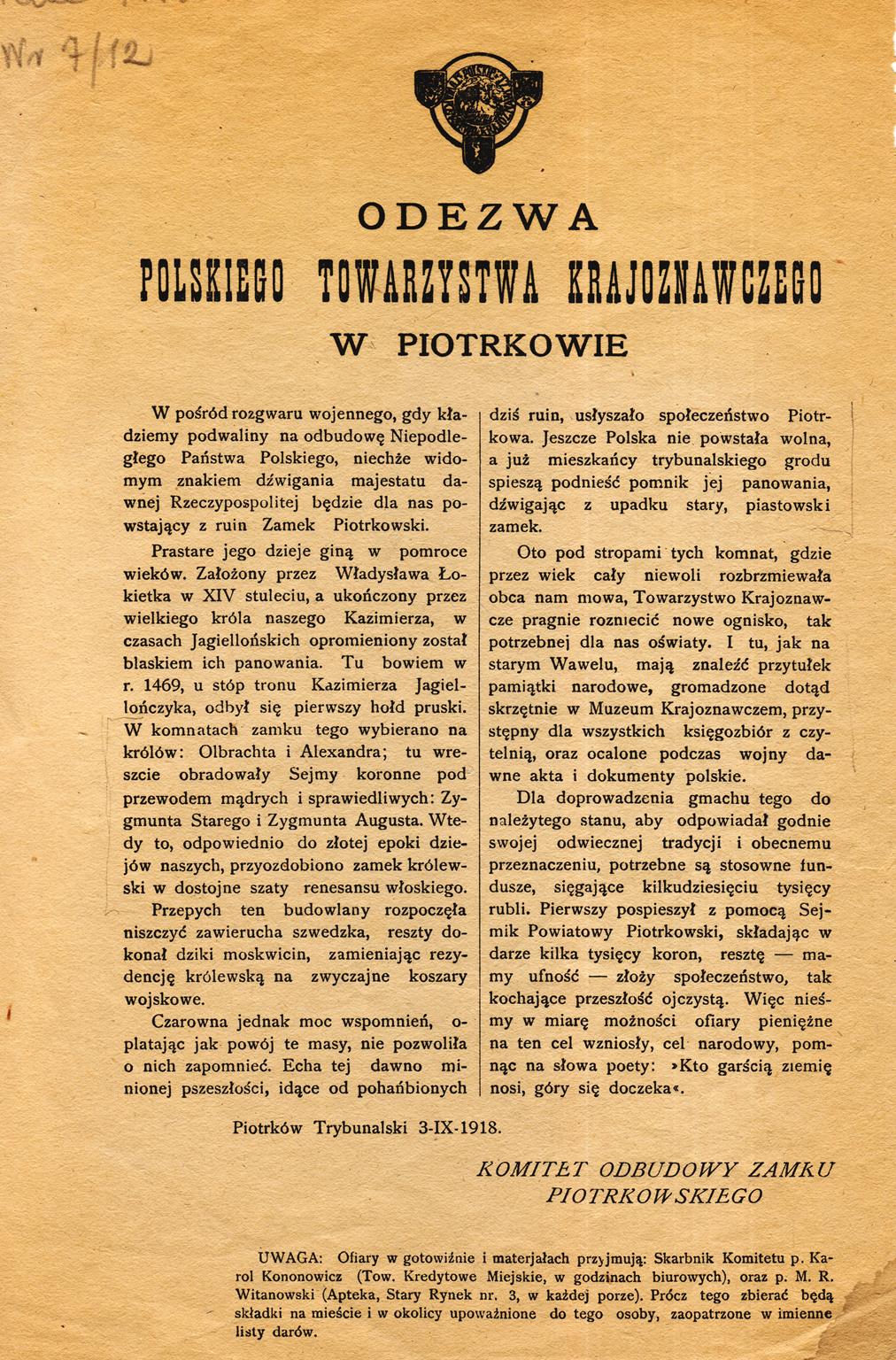 Cesarsko-królewska Komenda Powiatowa w Piotrkowie 25 października 1918 r., a więc niemal w ostatnich dniach urzędowania, przesłała Zarządowi Oddziału Polskiego Towarzystwa Krajoznawczego dokument poświadczający oddanie „Zamku Królewskiego” w opiekę i użytkowanie Polskiego Towarzystwa Krajoznawczego. Prawo własności zastrzeżono przy tym Rządowi Polskiemu. To przekazanie potwierdzone zostało w lipcu 1919 r. Wówczas Ministerstwo Kultury i Sztuki RP zdecydowało oddać zamek Polskiemu Towarzystwu Krajoznawczemu w użytkowanie na lat dziesięć z obowiązkiem opłacania czynszu dzierżawnego i wykonywania niezbędnych remontów. Od tego momentu zamek stał się oficjalnie siedzibą Oddziału Piotrkowskiego Polskiego Towarzystwa Krajoznawczego i Muzeum Krajoznawczego działającego w od 1909 r. w strukturach tej organizacji.