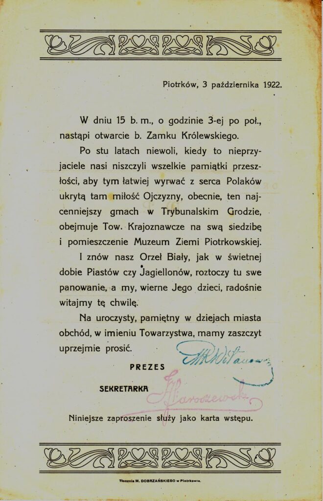 Uroczyste otwarcie dawnego zamku królewskiego odbyło się 15 października 1922 r. W przejętym obiekcie, zgodnie z zapowiedzią Komitetu Odbudowy Zamku Piotrkowskiego, znalazły miejsce „…pamiątki narodowe gromadzone dotąd skrzętnie w Muzeum Krajoznawczym, przystępny dla wszystkich księgozbiór z czytelnią oraz ocalone podczas wojny dawne akta i dokumenty polskie”. W 1930 r. Departament Kultury Ministerstwa Wyznań Religijnych i Oświecenia Publicznego wyraził zgodę na przedłużenie umowy dzierżawnej do 15 listopada 1940 r. Niestety funkcjonowanie Muzeum Krajoznawczego Ziemi Piotrkowskiej zostało przerwane wybuchem wojny we wrześniu 1939 r. Po jej zakończeniu przywrócono funkcje muzealne obiektu, a także podjęto kolejne etapy prac związanych z rekonstrukcją gmachu, który do dziś pozostaje siedzibą Muzeum w Piotrkowie Trybunalskim.