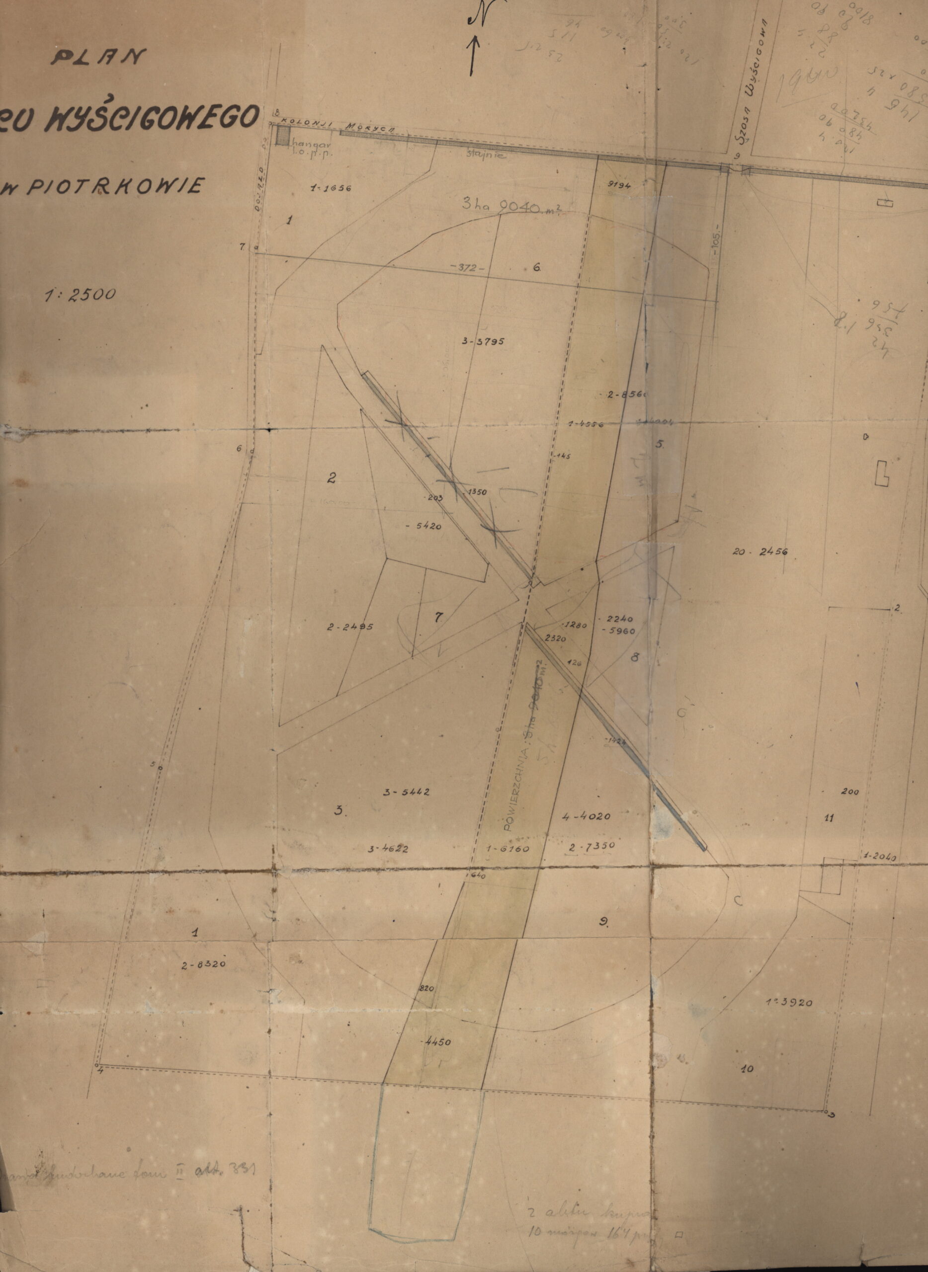 Co ciekawe, pierwszy pas startowy dla samolotów w Piotrkowie wytyczono wzdłuż biegu głównego toru wyścigowego (tak zwanego płaskiego). Oczywiście pas ten w niczym nie przypominał dobrze nam znanych współczesnych pasów startowych, nie był w żaden sposób specjalnie ogrodzony ani też utwardzony. Po prostu był to wydzielony odcinek terenu, trawiasty, po którym startowały samoloty, kiedy nie odbywały się wyścigi konne lub gdy zachodziła taka potrzeba. W 1927 roku ówczesny prezydent Piotrkowa, Kazimierz Szmidt, postanowił dokonać korekty gruntu wydzierżawionego Komitetowi LOPP na terenie Wyścigów Konnych, z korzyścią dla pierwszego z wymienionych. Decyzją prezydenta LOPP, zamiast dotychczasowego obszaru, rozciągającego się wzdłuż całego placu Wyścigów Konnych, otrzymał w dzierżawę teren położony w jego zachodnio-północnej części (obecnie w miejscu tym znajdują się zabudowania, hangary i stacja paliw Aeroklubu Ziemi Piotrkowskiej). Lotnisko w takiej wielkości przetrwało do wybuchu II wojny światowej.