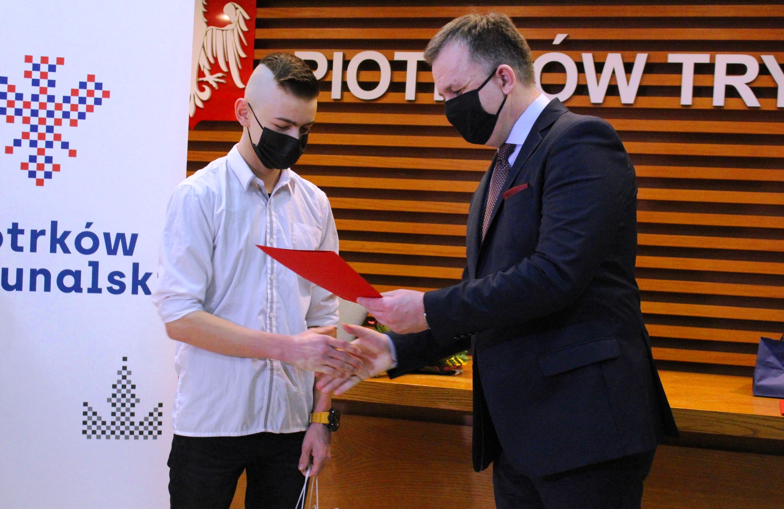 Uczeń IV LO, 17-letni Mateusz Siekacz z Piotrkowa, odebrał dziś (30.03) list pochwalny z rak Prezydenta Miasta Krzysztofa Chojniaka oraz Komendanta Miejskiego Policji w Piotrkowie, inspektora Krzysztofa Dąbrowskiego, za wzorową postawę obywatelską. Kilka dni temu, młody bohater będąc świadkiem kradzieży, rzucił się w pościg i ujął sprawczynię. Dziś doceniono jego bohaterski czyn.