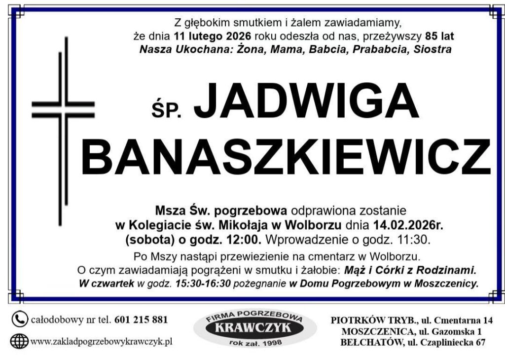 Msza święta pogrzebowa odprawiona zostanie się w sobotę 14 lutego o godz. 12:00 w Parafii Św. Mikołaja w Wolborzu.