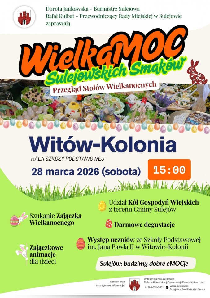 Już niebawem kolejny przegląd stołów wielkanocnych – WielkaMOC sulejowskich smaków! Organizatorzy zapraszają na sobotę, 28 marca 2026 roku, do hali sportowej przy Szkole Podstawowej imienia Jana Pawła II w Witowie-Kolonii. Od godziny 15:00 każdy będzie mógł skosztować świątecznych przysmaków, przygotowanych przez panie i panów z kół gospodyń wiejskich z terenu gminy Sulejów. Dzieci też na pewno nie będą się nudzić, ponieważ organizatorzy planują wiele atrakcji.