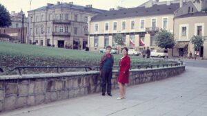 2. 22 lipca 1969 w Piotrkowie – na zdjeciu Wiesława Gnyp z synem Jerzym, a w tle restaracja Mozaika. Foto archiwum rodziny Gnypów.