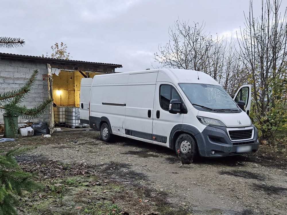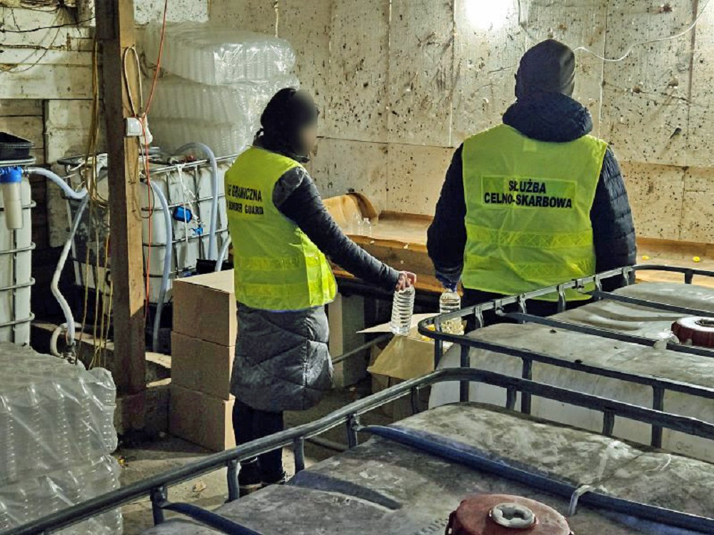 W wyniku przeszukania posesji, z której mógł pochodzić zatrzymany towar, funkcjonariusze znaleźli kolejne kartony z bezbarwną cieczą, instalację do filtrowania, pompy do przelewania, pojemniki typu mauser, plastikowe korki i butelki oraz kartony do pakowania butelek. Przeprowadzone przez mundurowych badanie alkoholomierzem losowo otwartych butelek potwierdziło, że znajduje się w nich alkohol o stężeniu ok. 86 %. Przeszukanie garażu należącego do jednego z zatrzymanych mężczyzn, pozwoliło dodatkowo na wykrycie 20 tys. szt. papierosów bez znaków akcyzy.