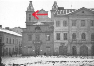 2. Widoczny otwór po zegarze jezuickim i gimnazjalnym na lewej wieży kościoła jezuickiego. 1938. Foto archiwum J. Gnypa