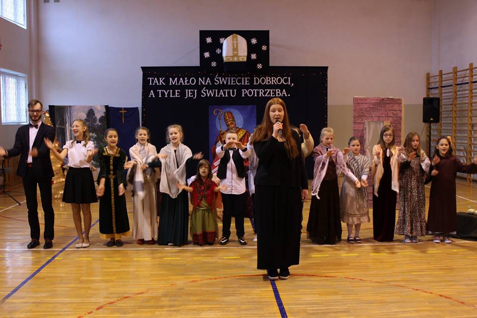 W występie artystycznym uczniowie przedstawili historię placówki, a także życie jej patrona, który pojawił się z workiem pełnym prezentów.