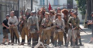 7. W piotrkowskich scenach Bitwy Warszawskiej zagrało aż 300 statystów – tu filmowa Armia Czerwona na ulicy Zamurowej.