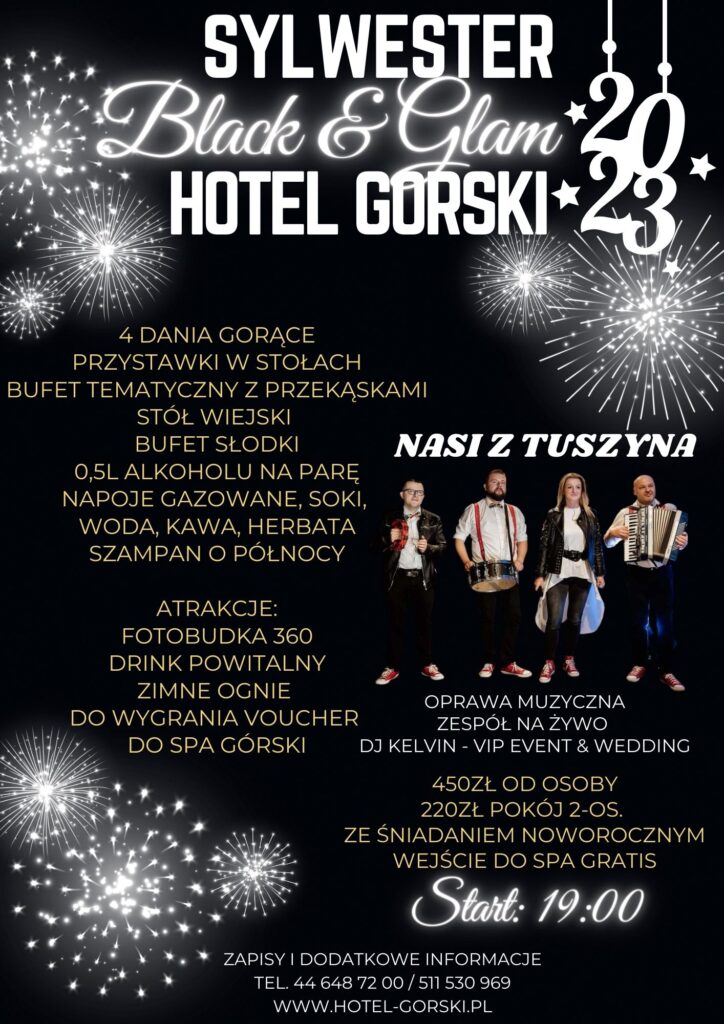 Zapraszamy serdecznie na najlepszy i największy Bal Sylwestrowy w naszym regionie. Oryginalny wystrój sali, niepowtarzalny klimat, pyszne jedzenie, profesjonalna obsługa i najlepsza muzyka. To wszystko i jeszcze więcej, znajdziecie Państwo na imprezie Sylwester 2023 Górski – Hotel & Spa w Proszeniu.
