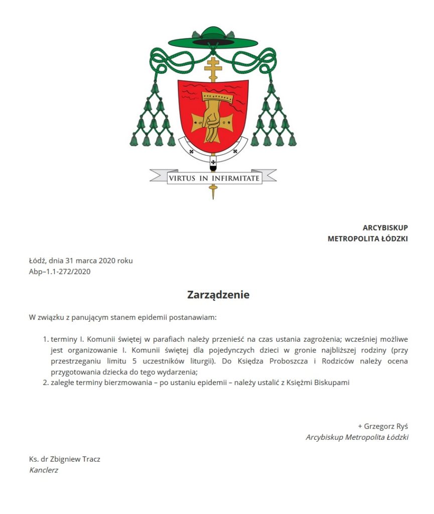 Metropolita Łódzki Arcybiskup Grzegorz Ryś wydał zarządzenie w sprawie bierzmowania i Pierwszych Komunii Świętych. Duchowny zaleca, by terminy obrzędów były przesunięte.