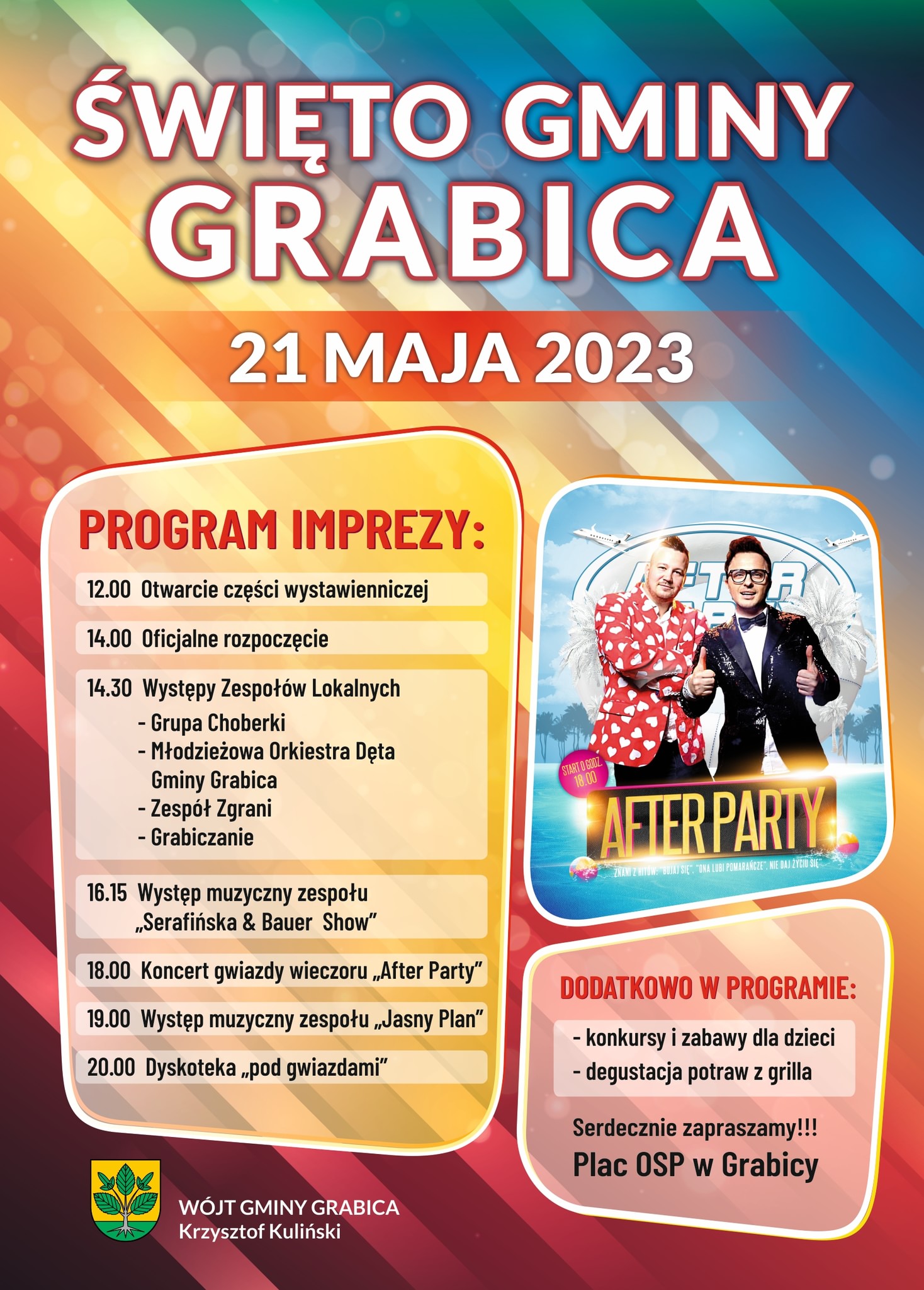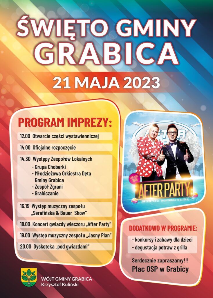 Święto Gminy Grabica odbędzie się w tym roku 21 maja. Rodzinny piknik zaplanowano tradycyjnie na placu przy strażnicy w Grabicy. Początek o 12:00. Od tej godziny zwiedzać będzie można część wystawienniczą festynu. Dwie godziny później, zaplanowano oficjalnie rozpoczęcie imprezy, a przybyłych gości przywita wójt Krzysztof Kuliński. Od 14:30 na scenie występować będą zespoły lokalne: Choberki, Młodzieżowa Orkiestra Dęta, Zespół Zgrani a także Grabiczanie. O 16:15 zaprezentuje się zespół „Serafińska & Bauer Show”, z kolei występ gwiazdy wieczoru – zespołu After Party zaplanowano na godzinę 18:00. Po nim, o 19:00 zagra Jasny Plan. Od godziny 20:00 publiczność zabawiać będzie DJ. Rozpocznie się wtedy dyskoteka pod gwiazdami. Dodatkowo organizatorzy przewidzieli konkursy i zabawy dla dzieci, a także degustację potraw z grilla.