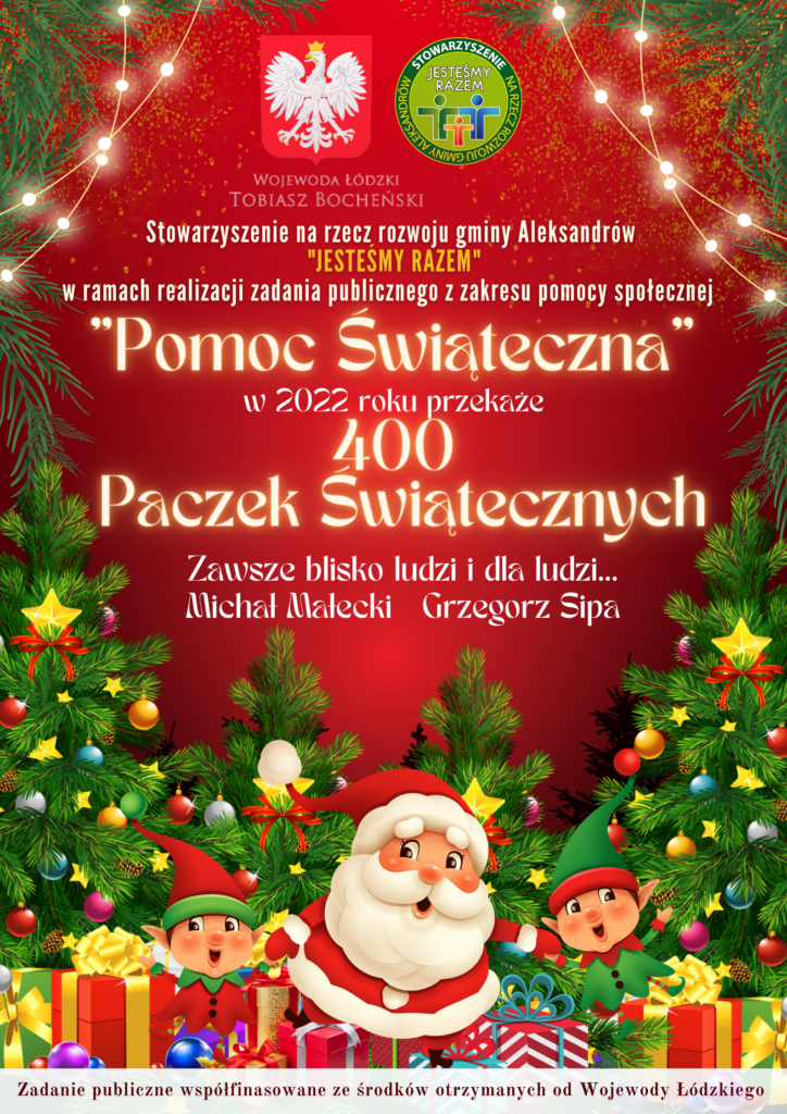 Stowarzyszenie na rzecz rozwoju gminy Aleksandrów „Jesteśmy Razem” otrzymało od Wojewody Łódzkiego dofinansowanie na realizację zadania z zakresu pomocy społecznej pn. „Pomoc Świąteczna” w 2022 roku. Organizacja społeczna wypełnia lukę w pomocy charytatywnej głównie na terenie gminy Aleksandrów, ale także w powiecie piotrkowskim.