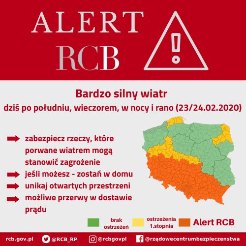 W Polsce prognozowany jest bardzo silny wiatr. Jego porywy mogą osiągać 110 km/h. Dlatego dzisiaj został wysłany sms z ostrzeżeniem: „Uwaga! Dziś po południu i w nocy (23/24.02) bardzo silny wiatr. Zabezpiecz rzeczy, które porwane wiatrem mogą stanowić zagrożenie. Unikaj otwartych przestrzeni.”