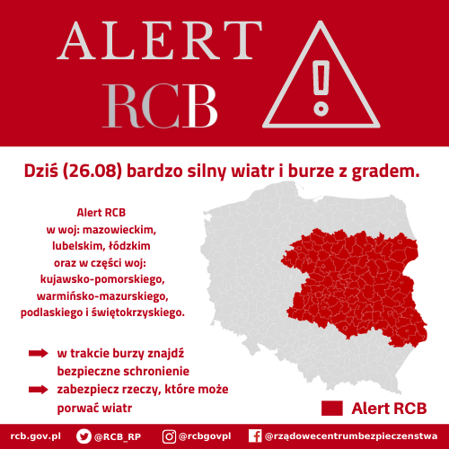 Rządowe Centrum Bezpieczeństwa informuje: Dziś (26.08) bardzo silny wiatr i burze z gradem. W trakcie burzy znajdź bezpieczne schronienie. Zabezpiecz rzeczy, które może porwać wiatr.