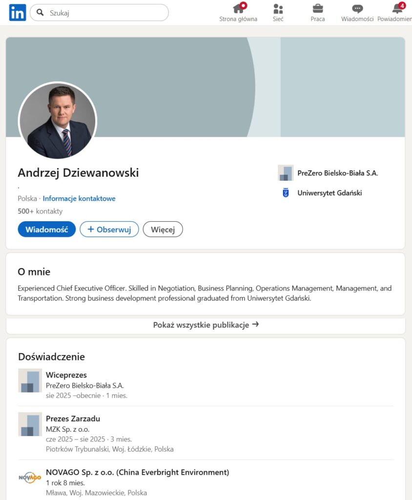 Były prezes piotrkowskiego MZK nie pozostawał jednak długo bez pracy. Według informacji, które dostępne są w internecie, Andrzej Dziewanowski 1 sierpnia 2025 roku został powołany na stanowisko wiceprezesa zarządu w firmie PreZero w Bielsku-Białej.