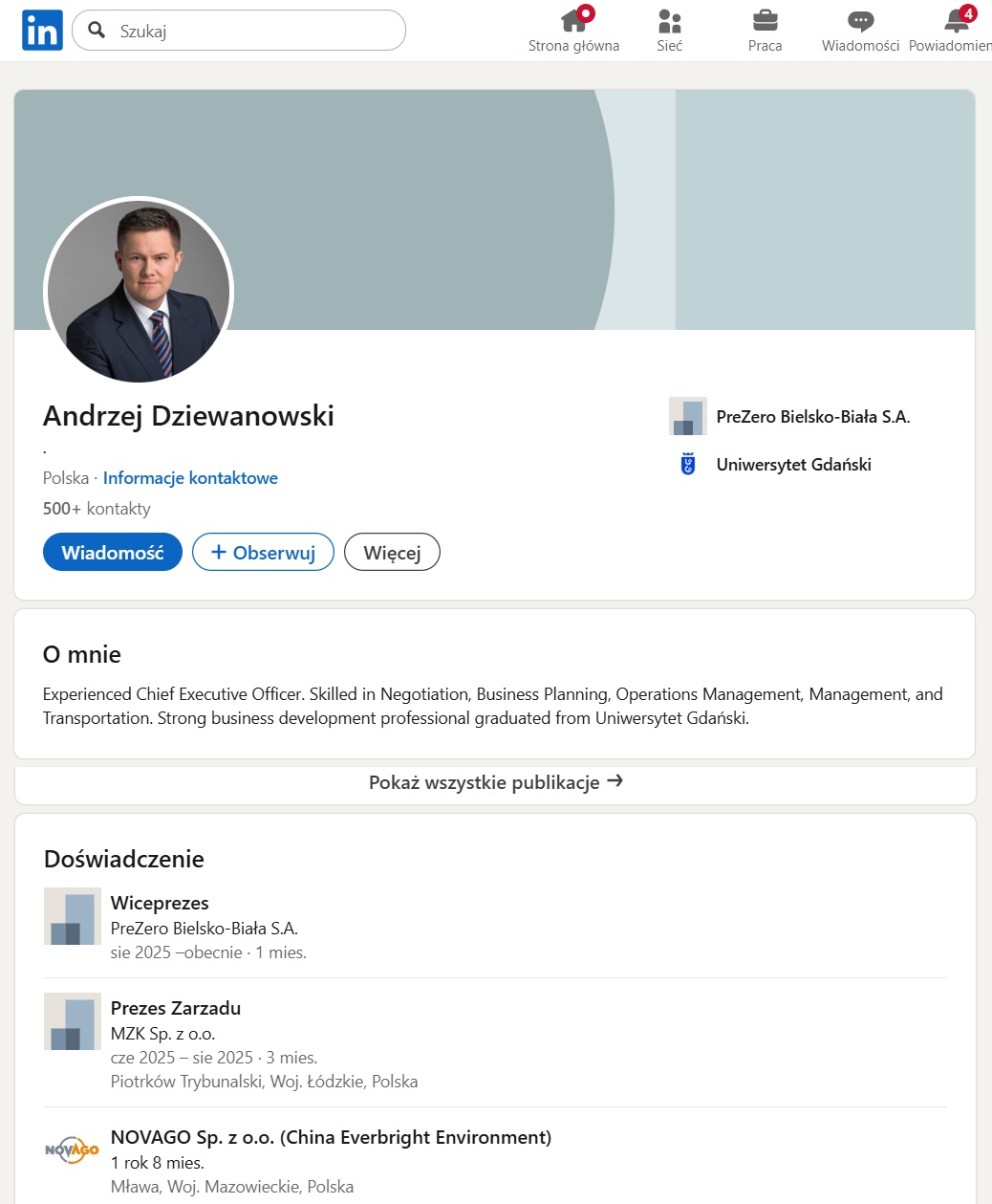 Były prezes piotrkowskiego MZK nie pozostawał jednak długo bez pracy. Według informacji, które dostępne są w internecie, Andrzej Dziewanowski 1 sierpnia 2025 roku został powołany na stanowisko wiceprezesa zarządu w firmie PreZero w Bielsku-Białej.