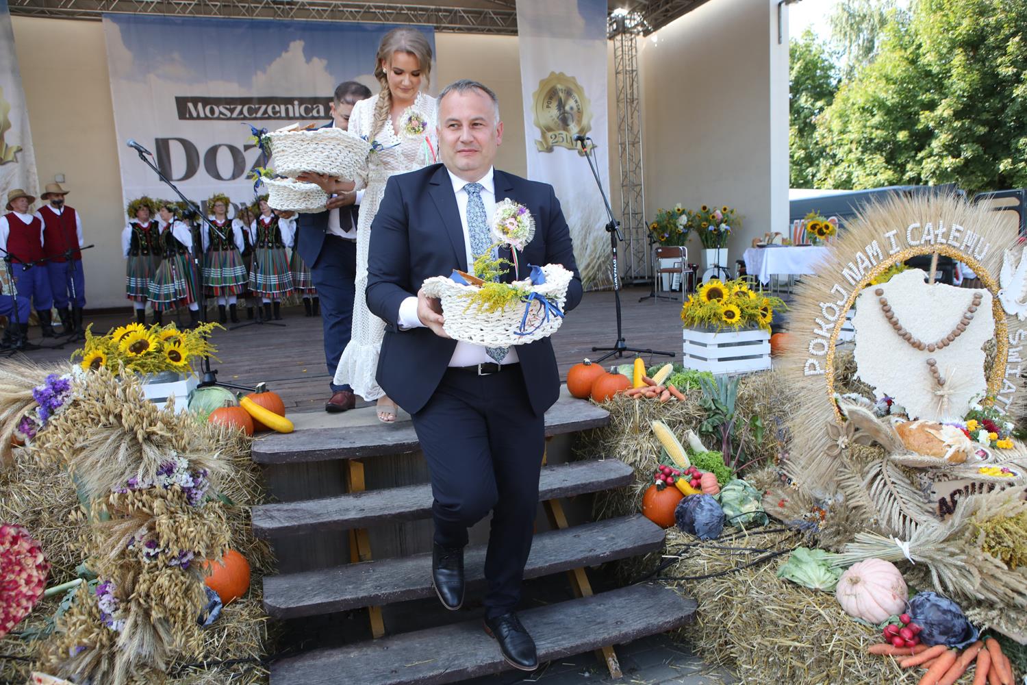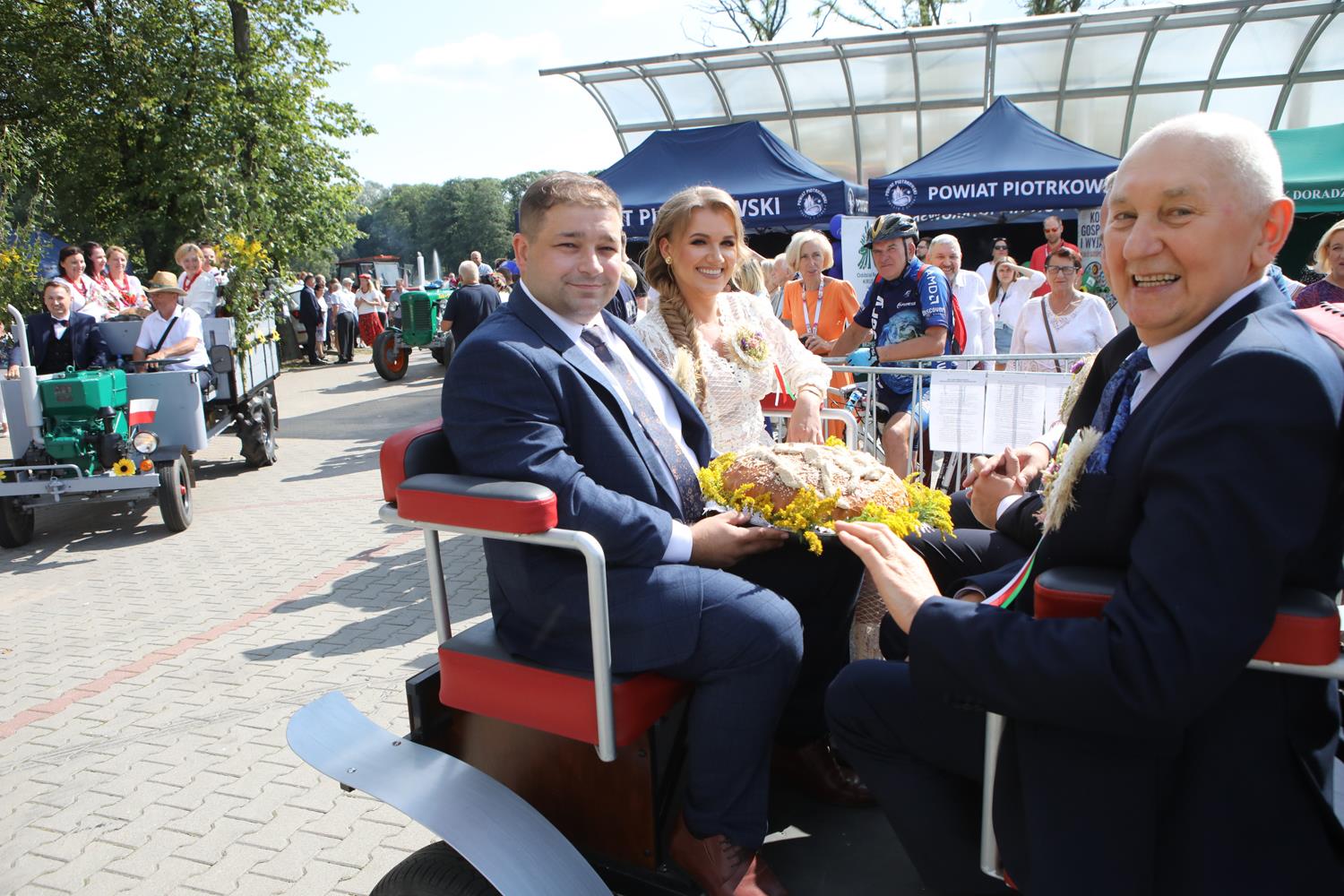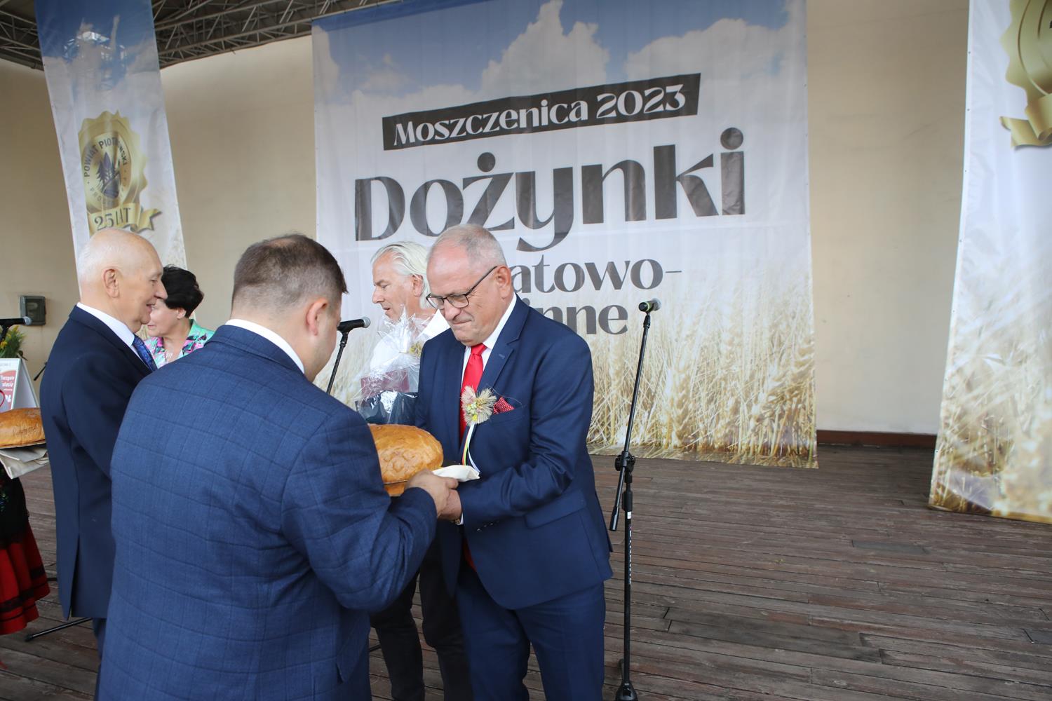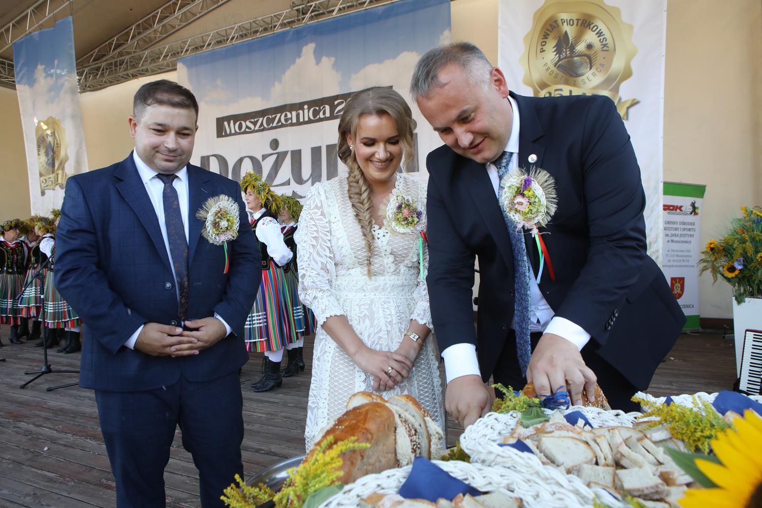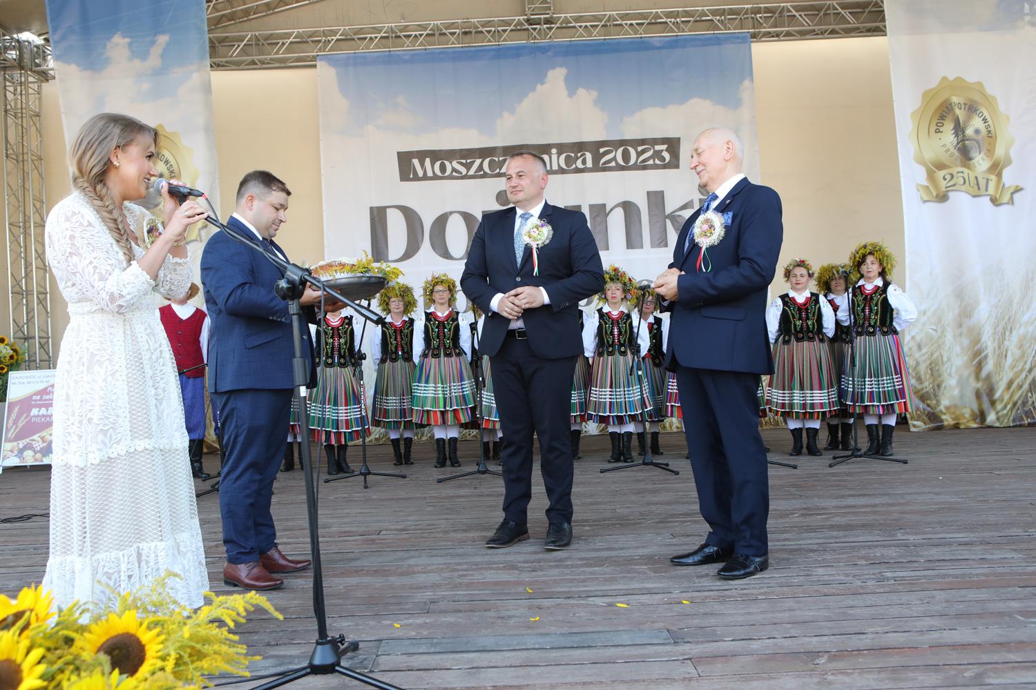 Starostowie dożynek Dominika Misztela z Kamocinka i Kamil Mirowski z Rękoraja obdarowali gospodarzy – Starostę Powiatu Piotrkowskiego Piotra Wojtysiaka i Wójta Gminy Moszczenicy Marcelego Piekarka.