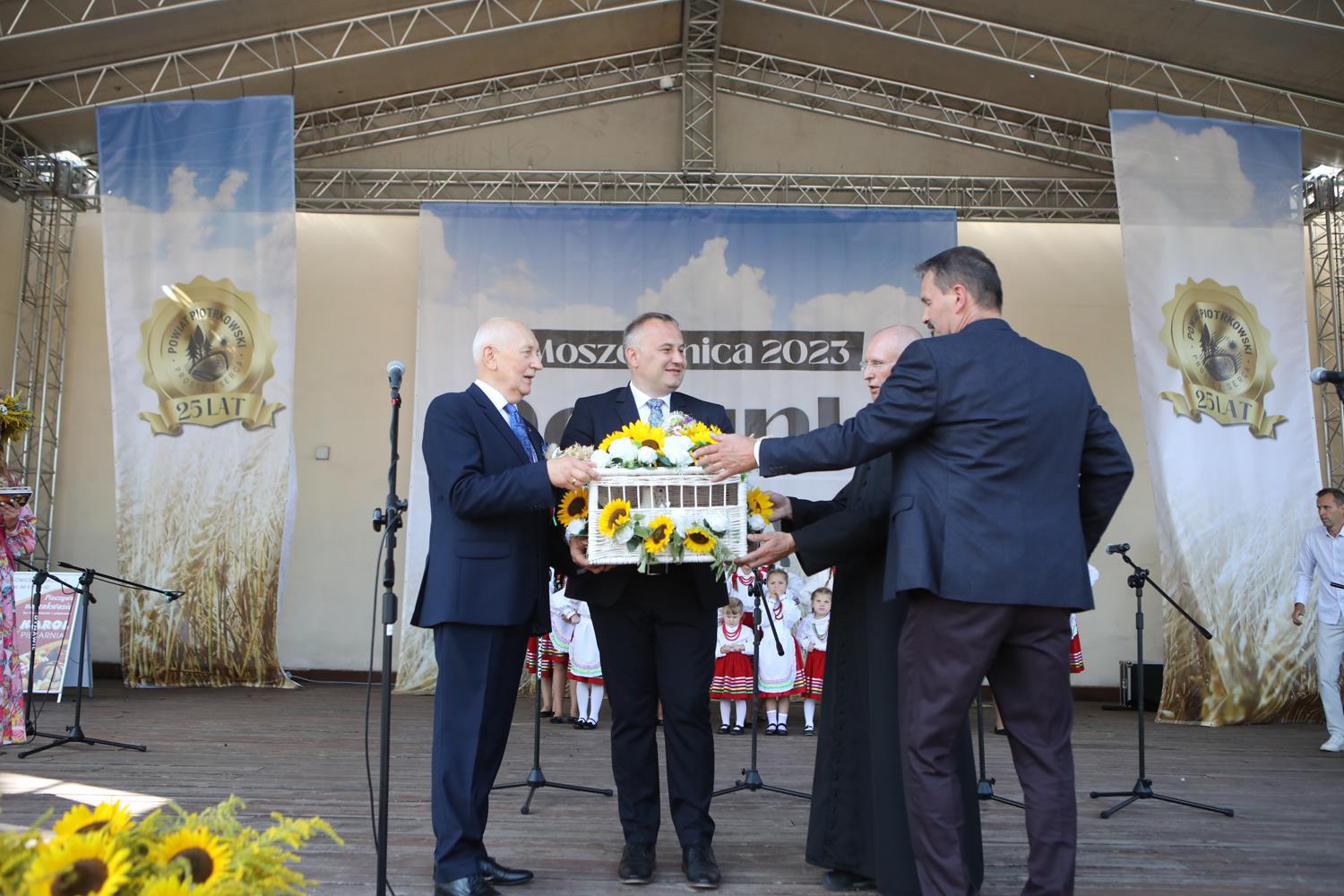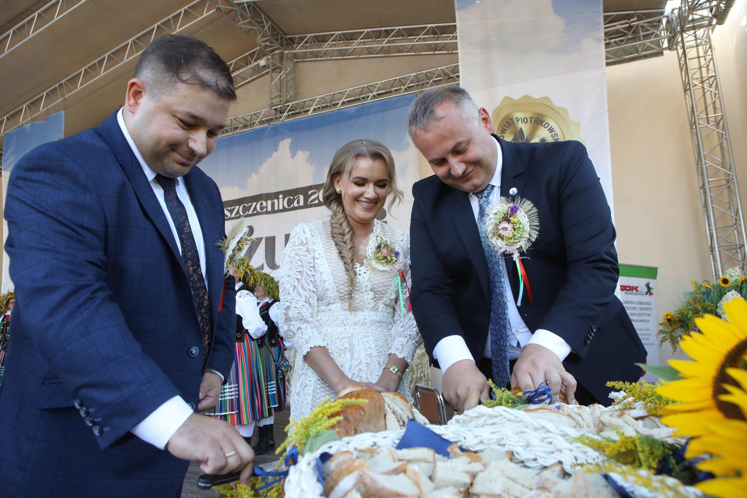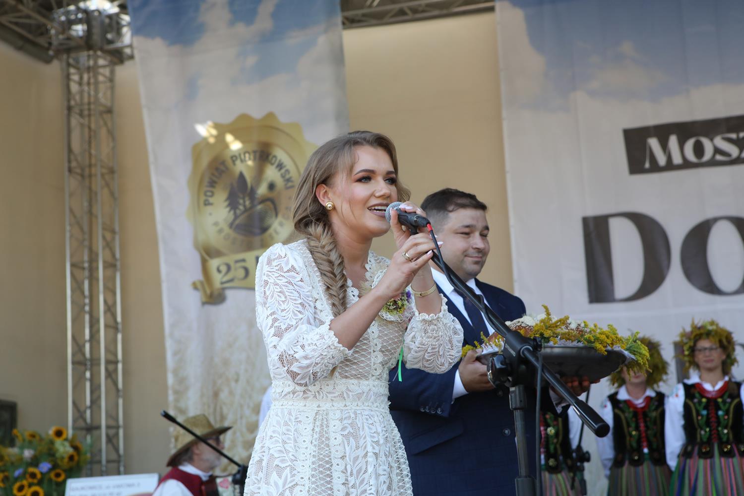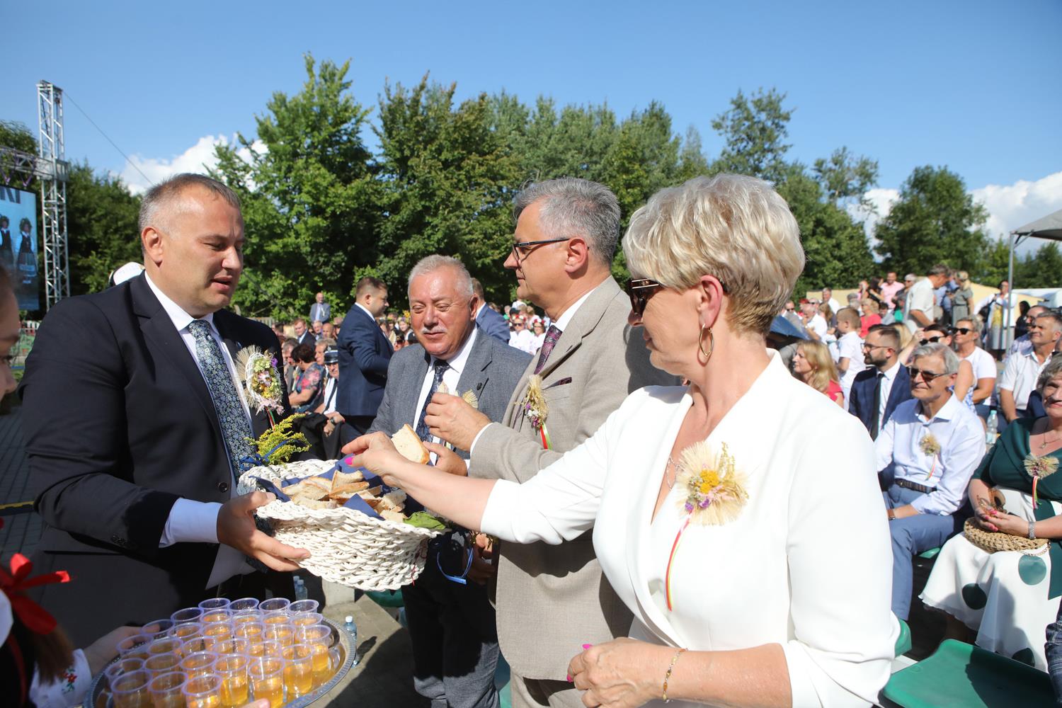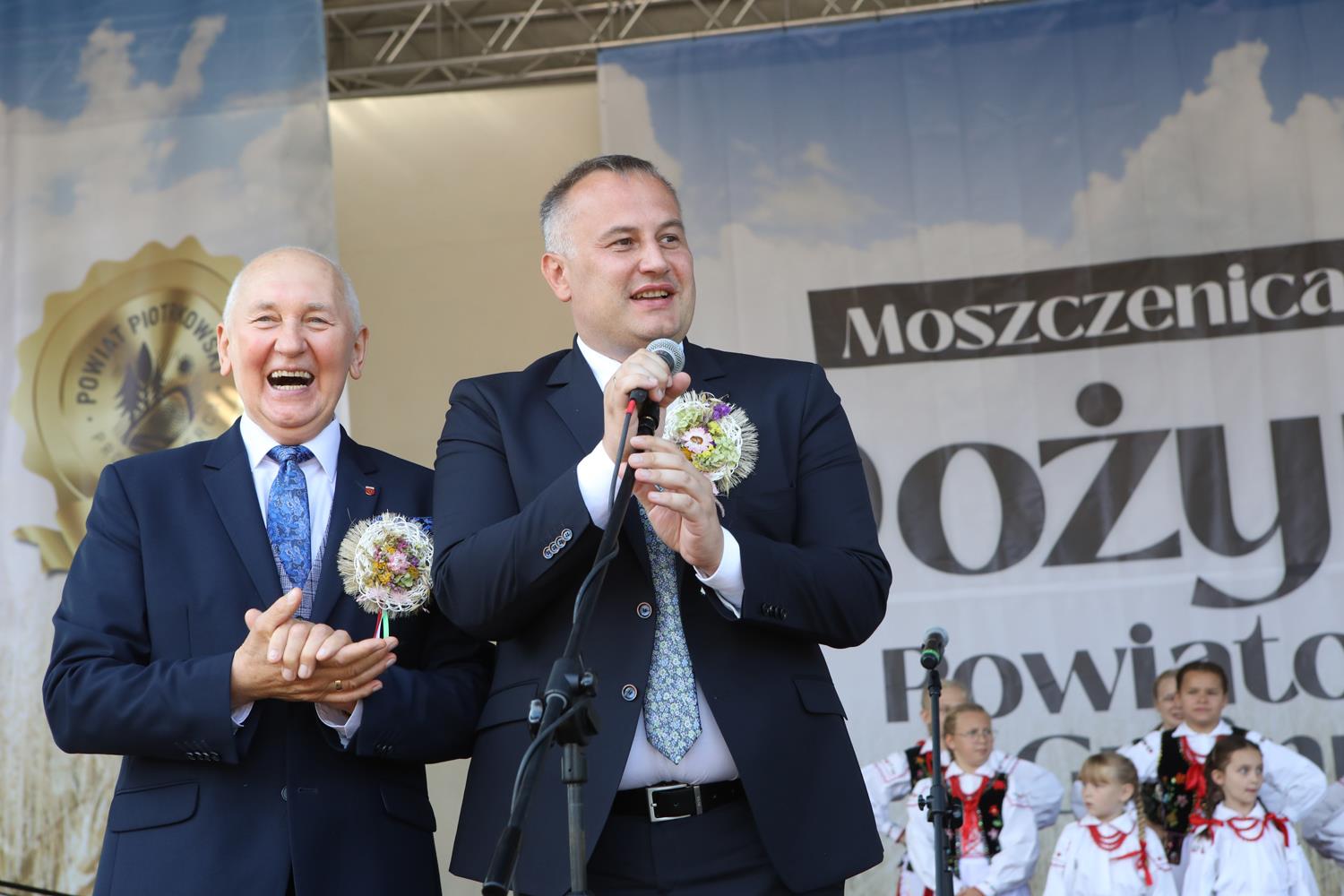 Starostowie dożynek Dominika Misztela z Kamocinka i Kamil Mirowski z Rękoraja obdarowali gospodarzy – Starostę Powiatu Piotrkowskiego Piotra Wojtysiaka i Wójta Gminy Moszczenicy Marcelego Piekarka.