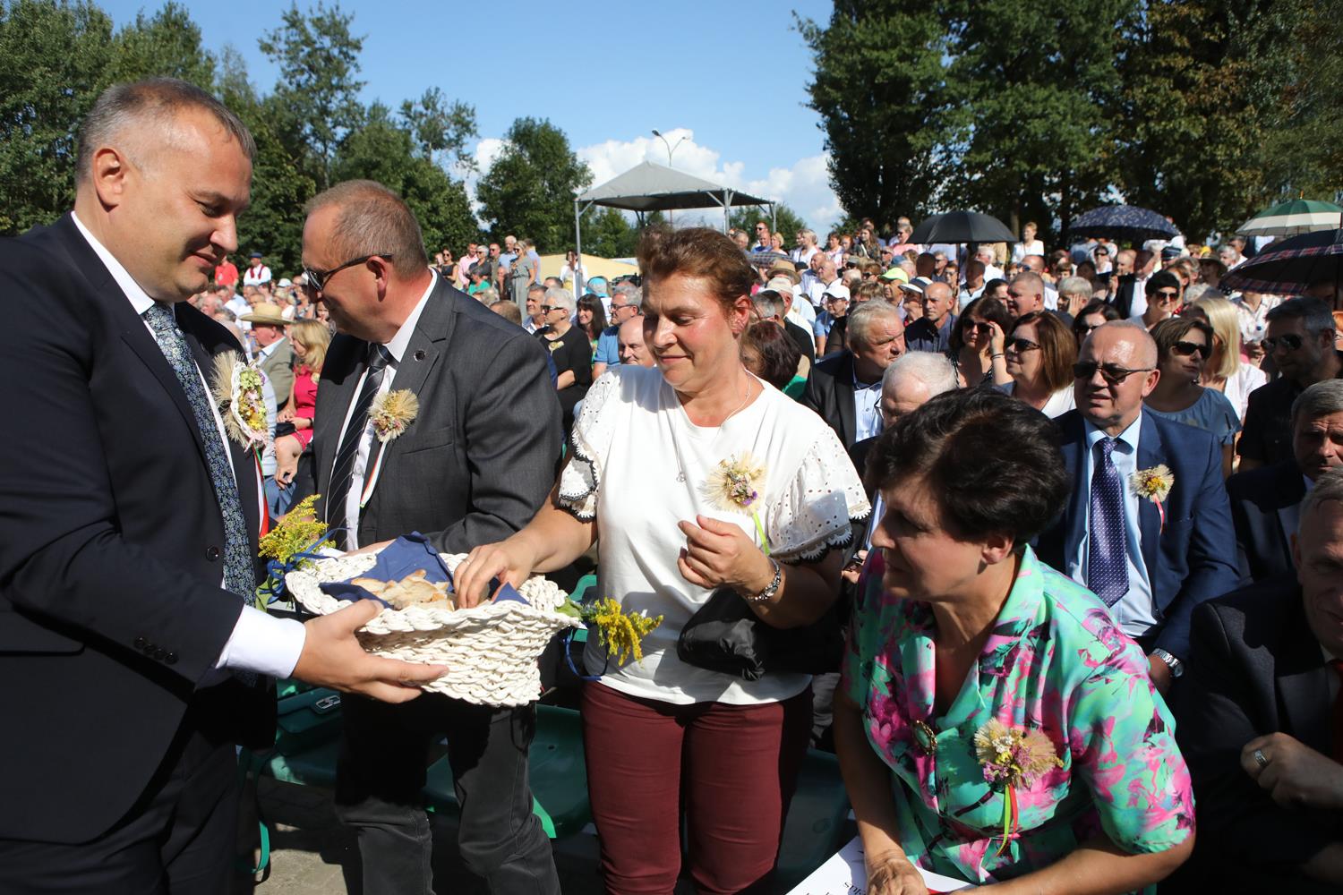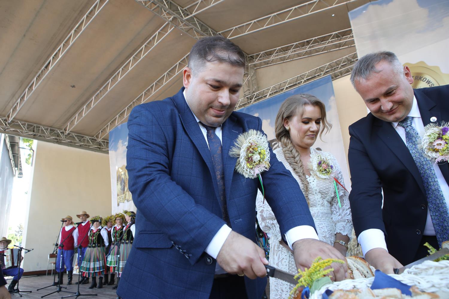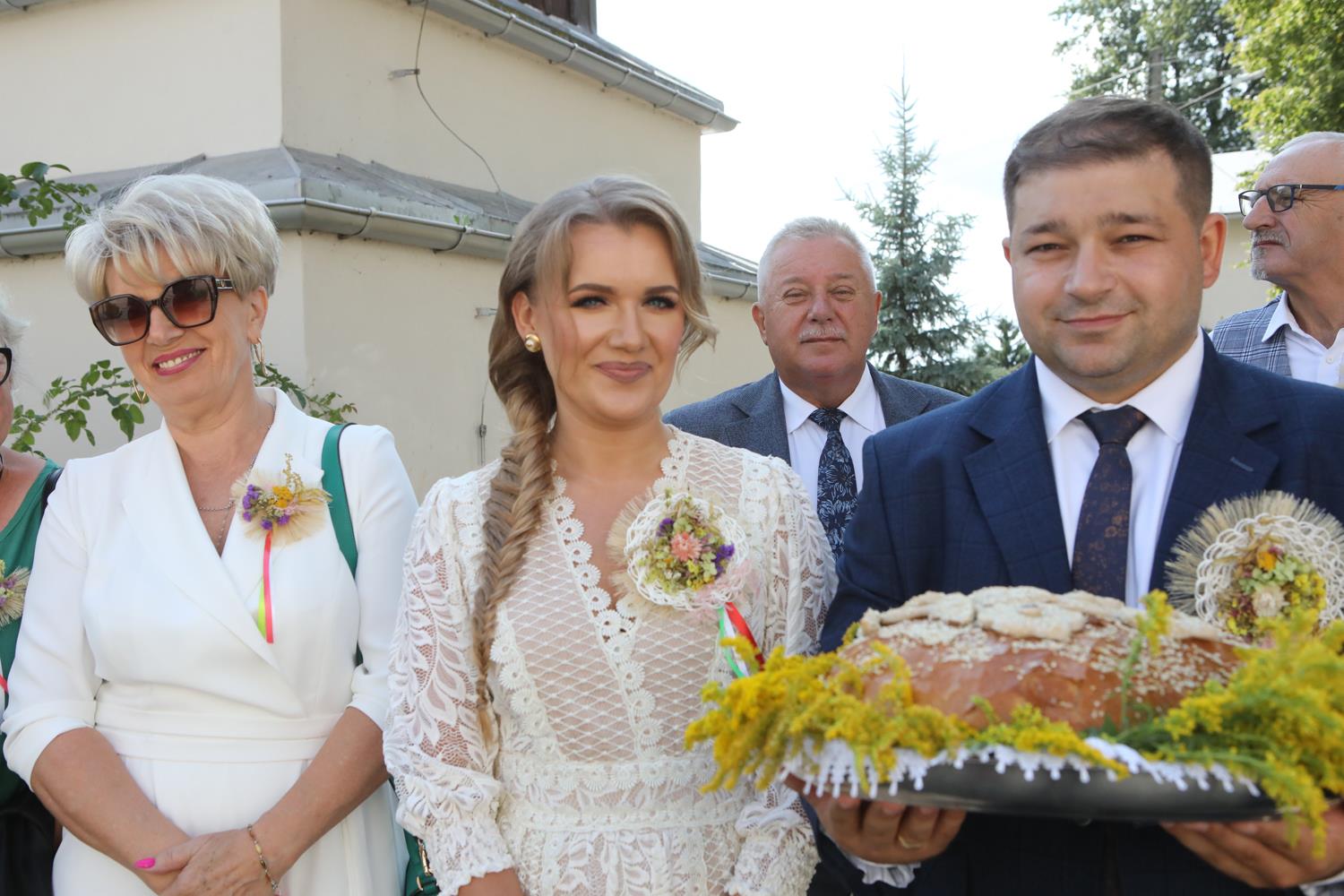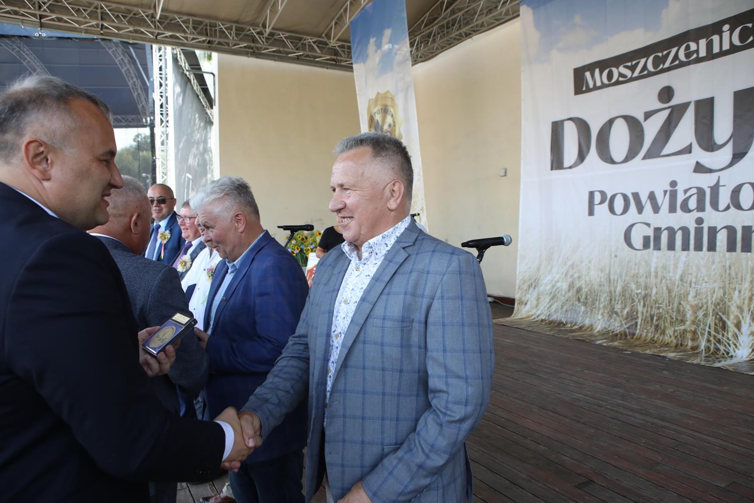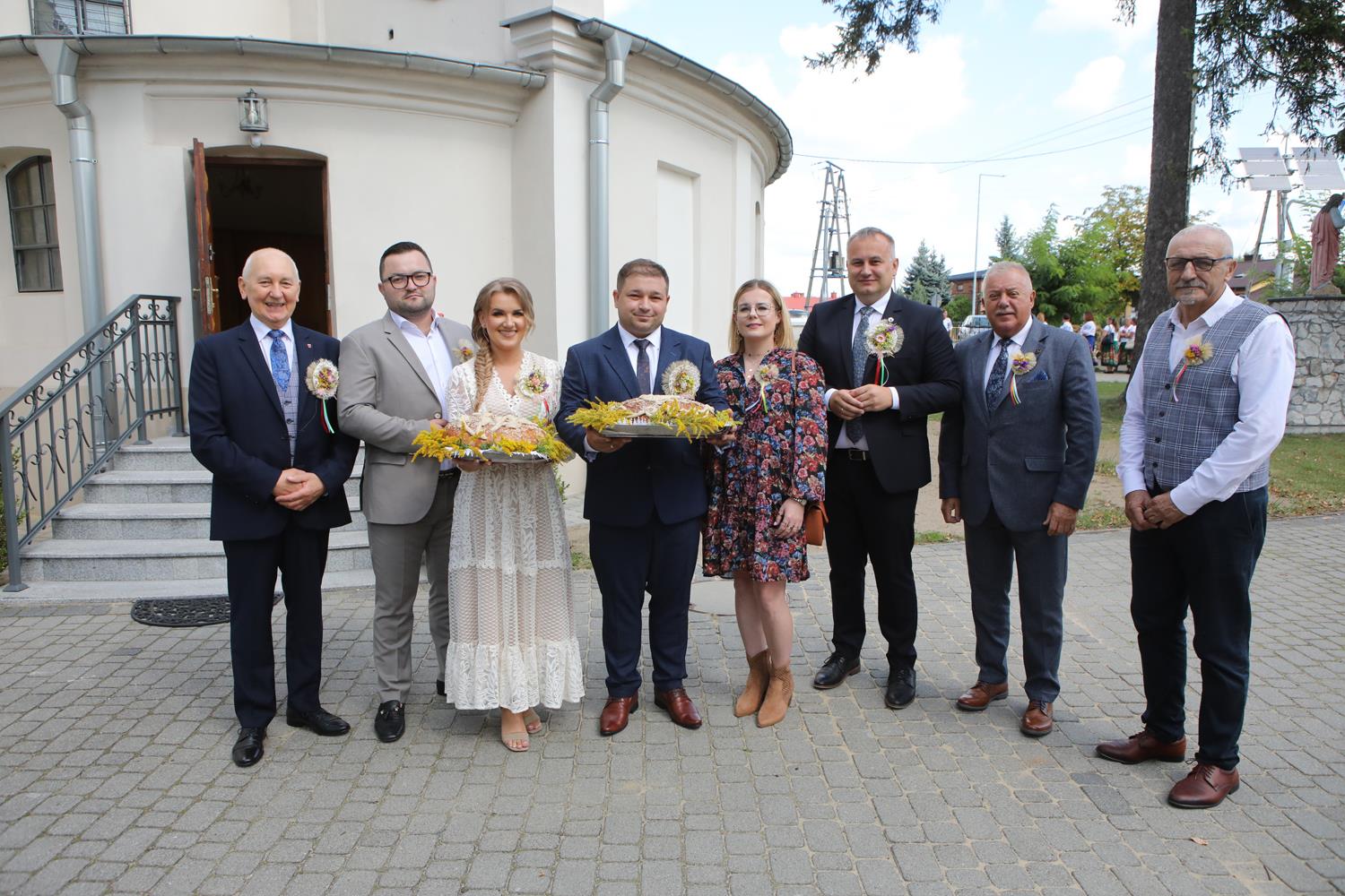 Starostowie dożynek Dominika Misztela z Kamocinka i Kamil Mirowski z Rękoraja obdarowali gospodarzy – Starostę Powiatu Piotrkowskiego Piotra Wojtysiaka i Wójta Gminy Moszczenicy Marcelego Piekarka.