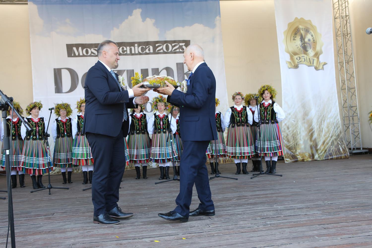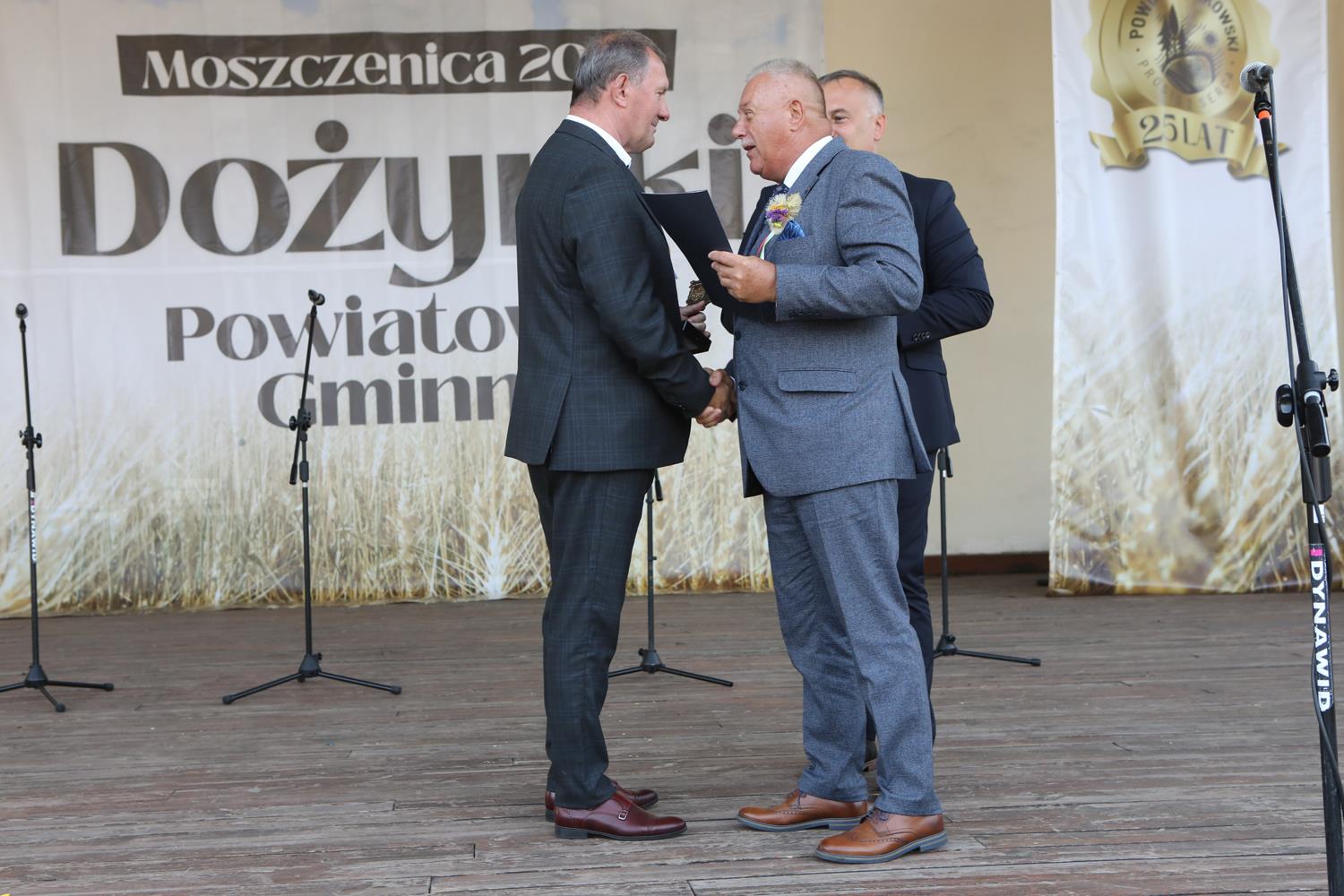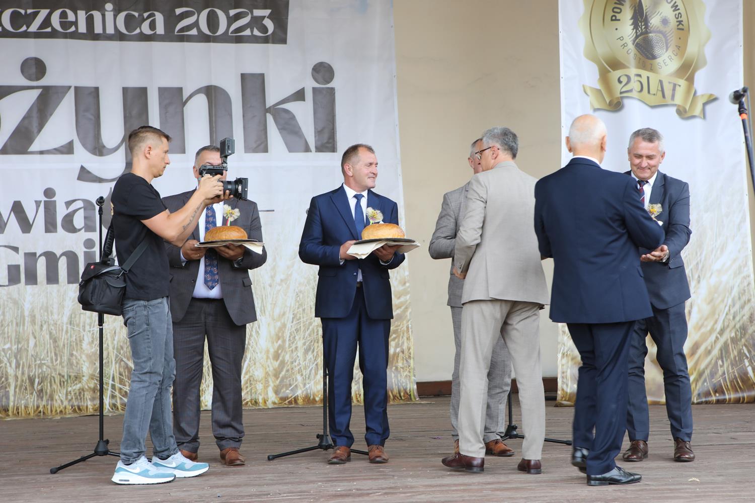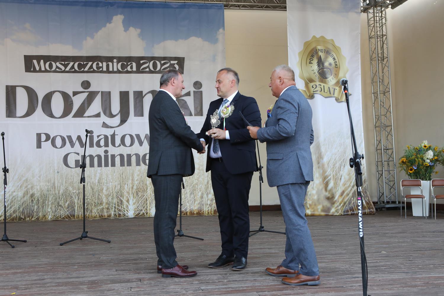 Starostowie dożynek Dominika Misztela z Kamocinka i Kamil Mirowski z Rękoraja obdarowali gospodarzy – Starostę Powiatu Piotrkowskiego Piotra Wojtysiaka i Wójta Gminy Moszczenicy Marcelego Piekarka.