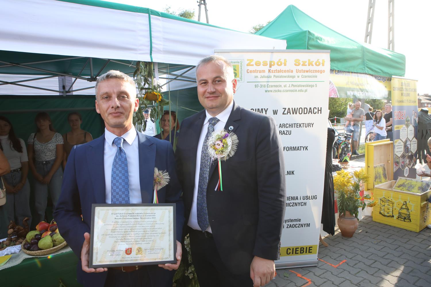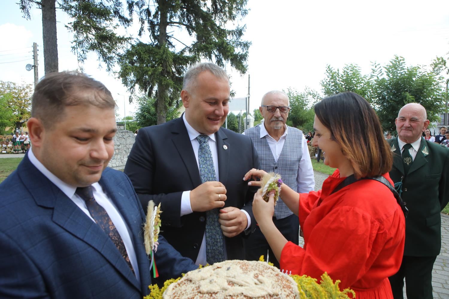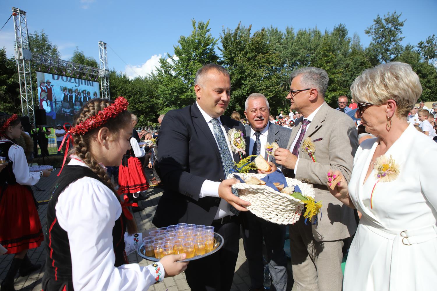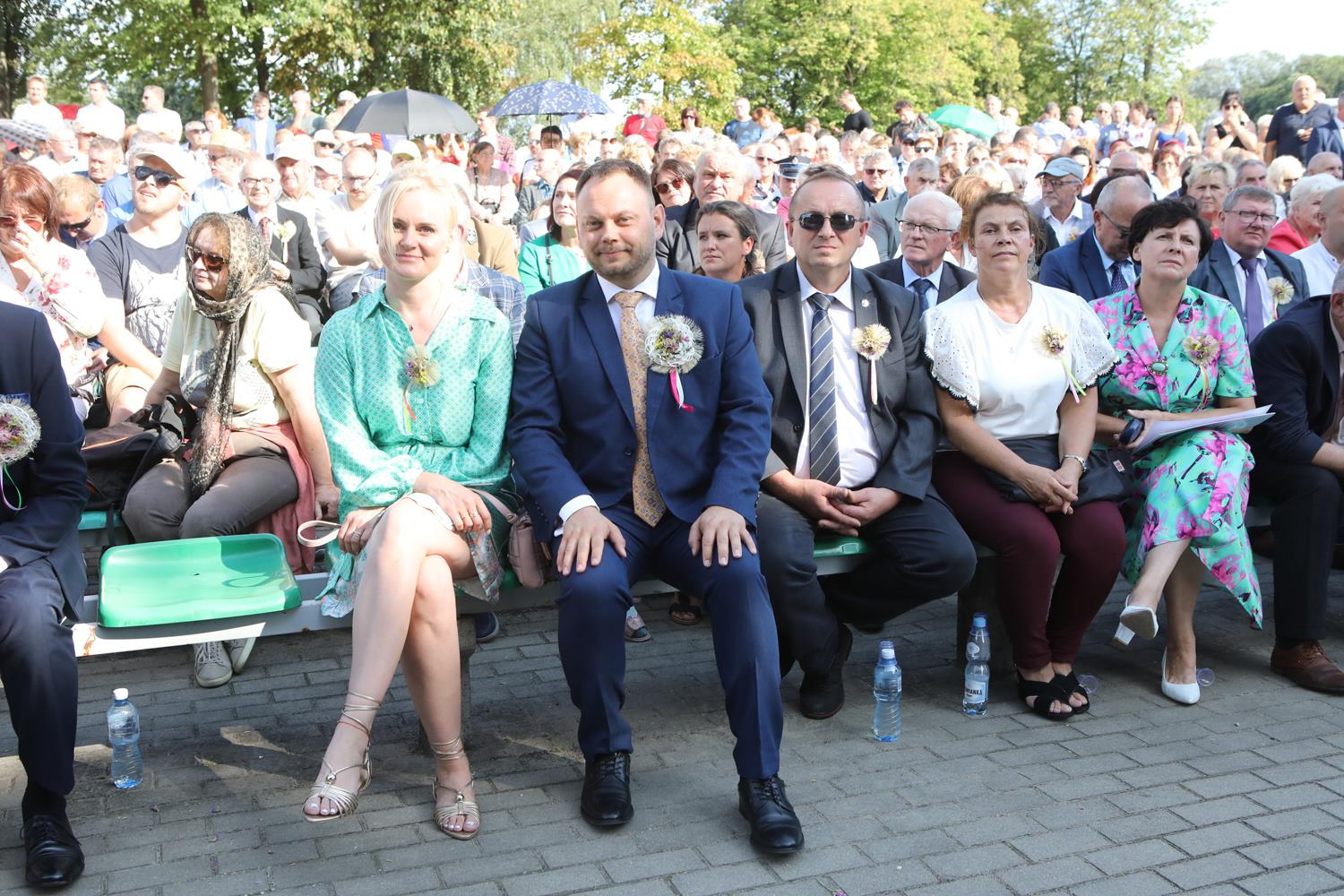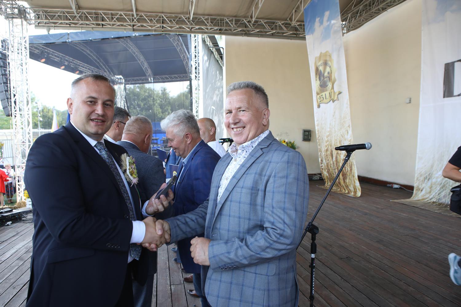 Starostowie dożynek Dominika Misztela z Kamocinka i Kamil Mirowski z Rękoraja obdarowali gospodarzy – Starostę Powiatu Piotrkowskiego Piotra Wojtysiaka i Wójta Gminy Moszczenicy Marcelego Piekarka.