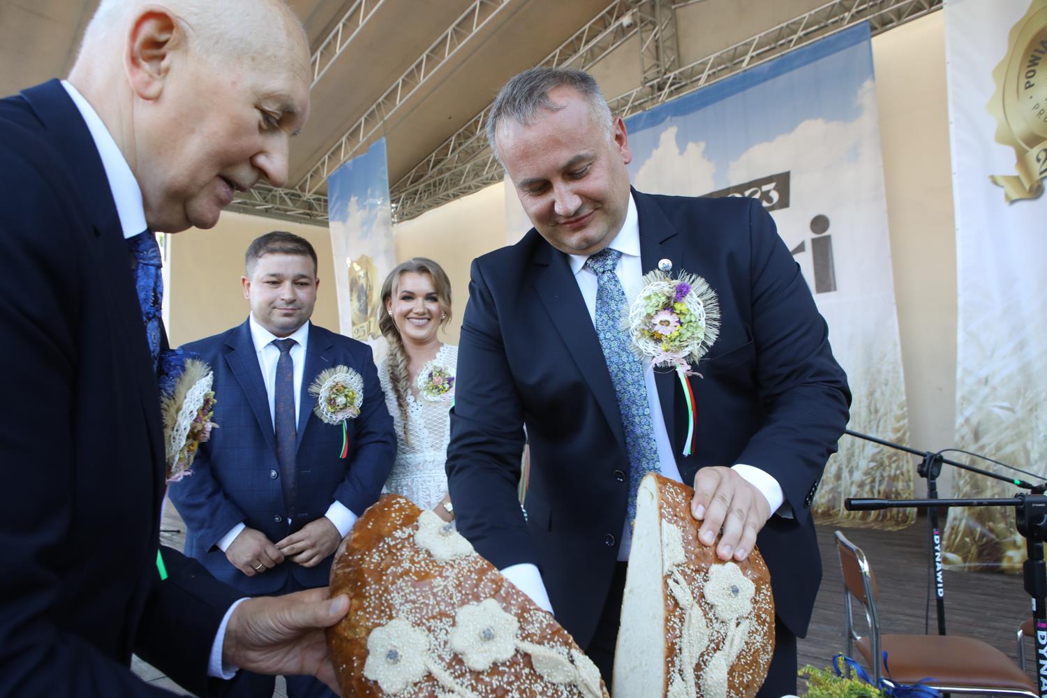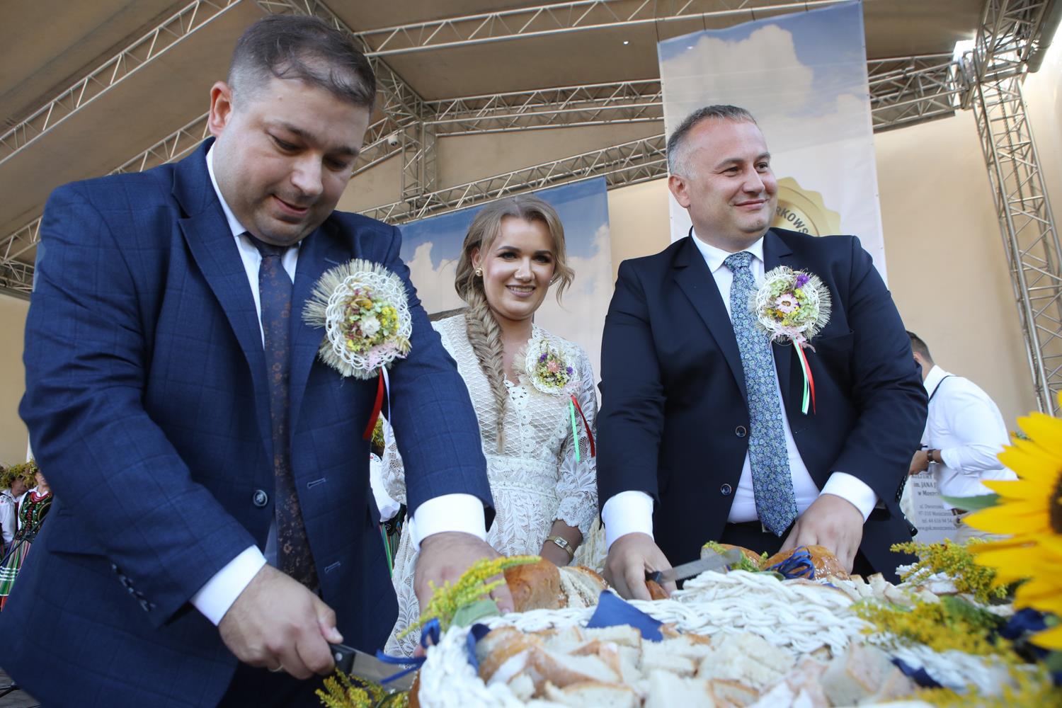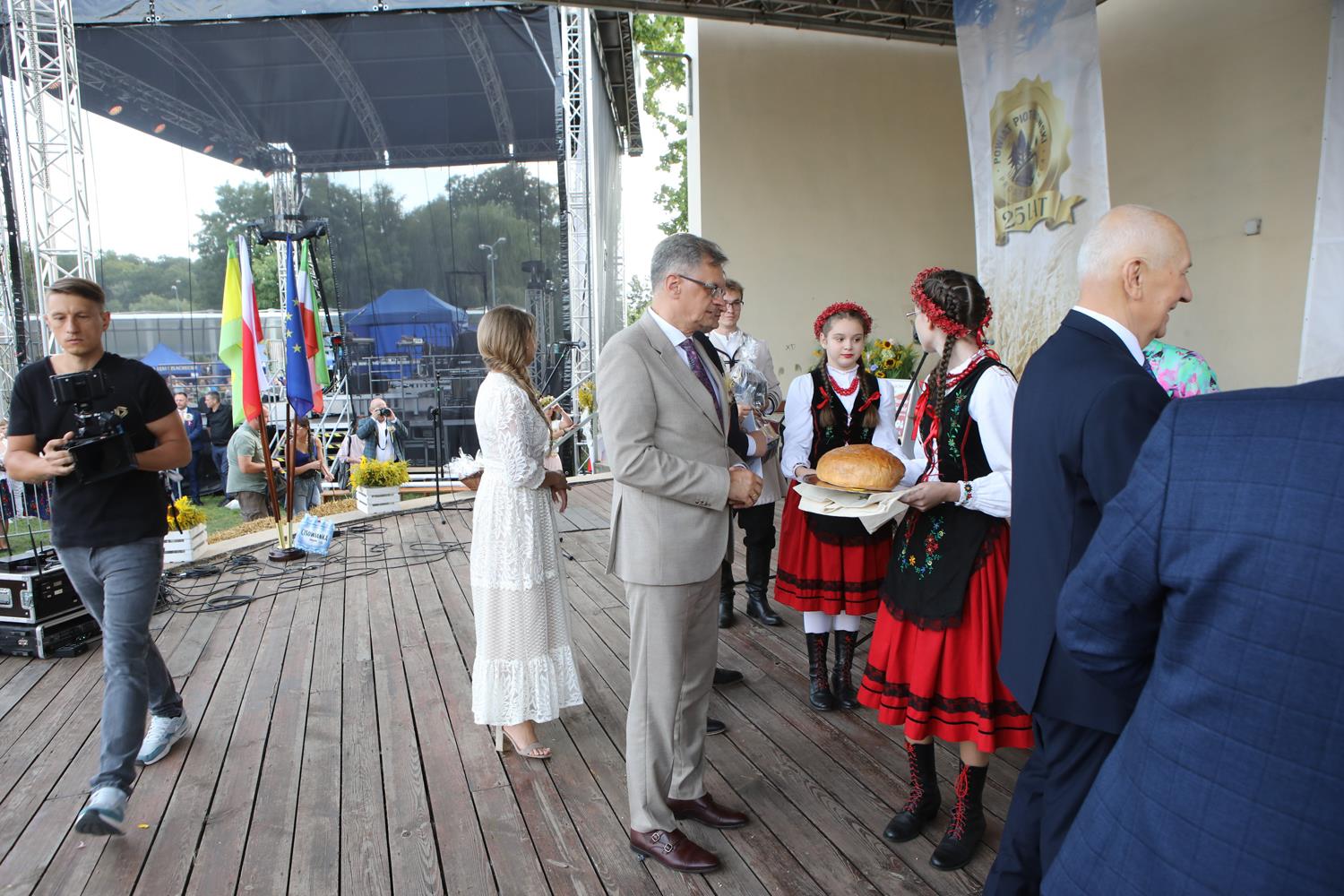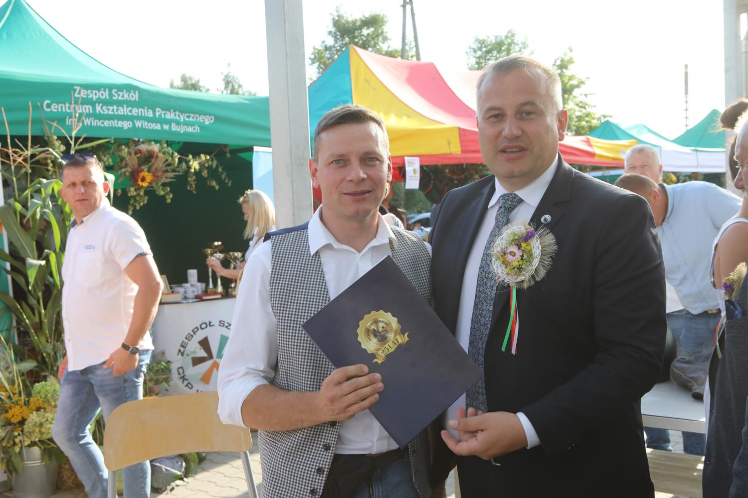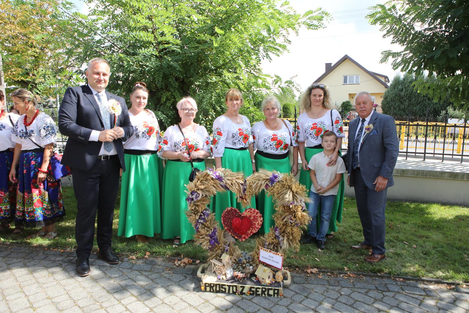 Starostowie dożynek Dominika Misztela z Kamocinka i Kamil Mirowski z Rękoraja obdarowali gospodarzy – Starostę Powiatu Piotrkowskiego Piotra Wojtysiaka i Wójta Gminy Moszczenicy Marcelego Piekarka.