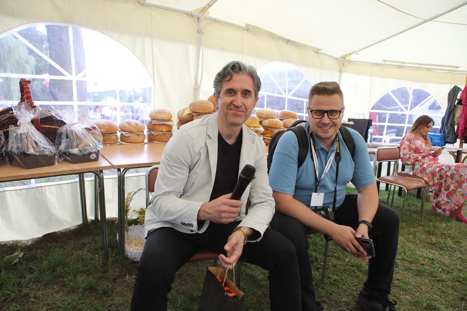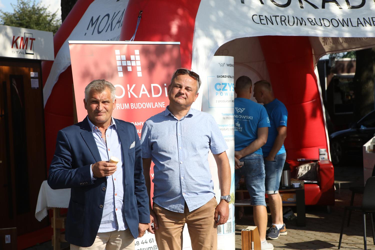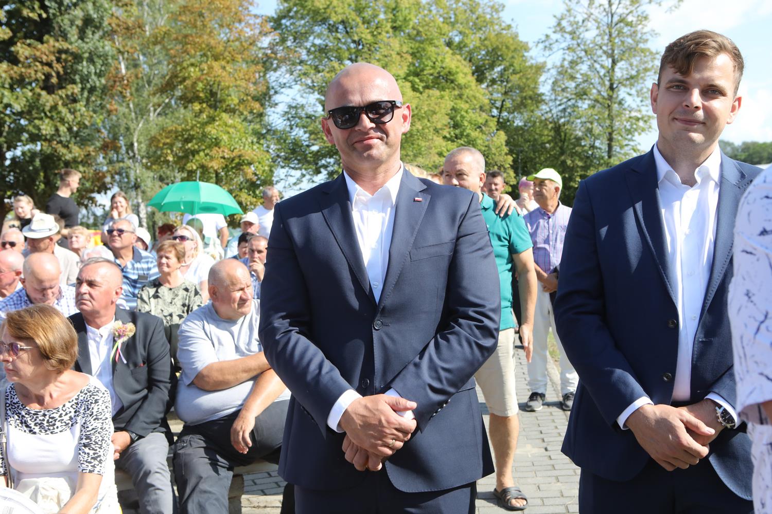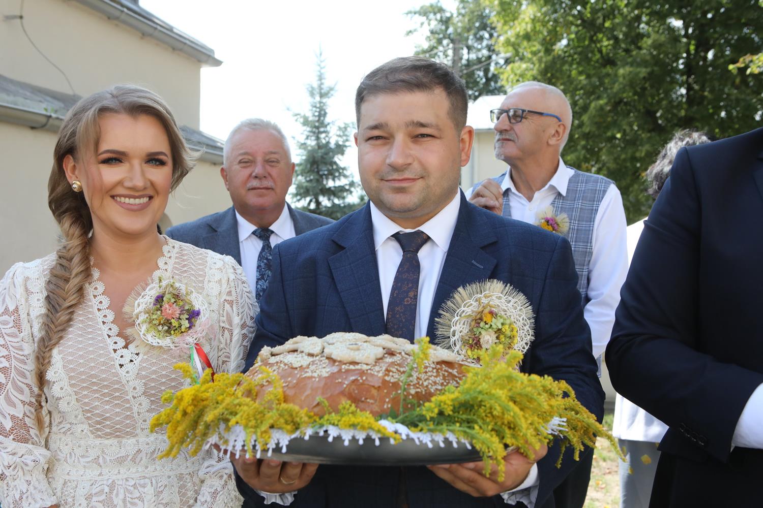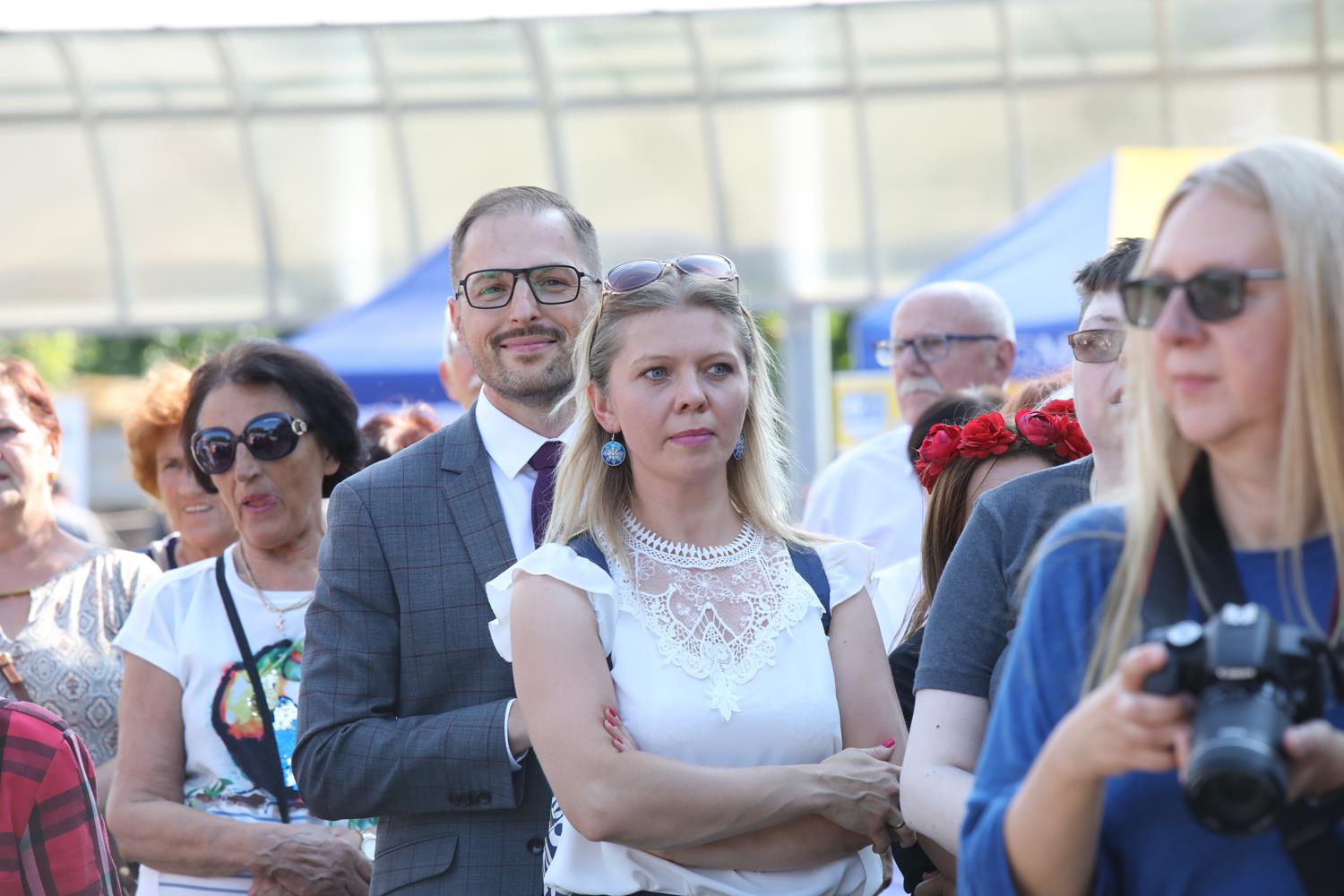 Starostowie dożynek Dominika Misztela z Kamocinka i Kamil Mirowski z Rękoraja obdarowali gospodarzy – Starostę Powiatu Piotrkowskiego Piotra Wojtysiaka i Wójta Gminy Moszczenicy Marcelego Piekarka.