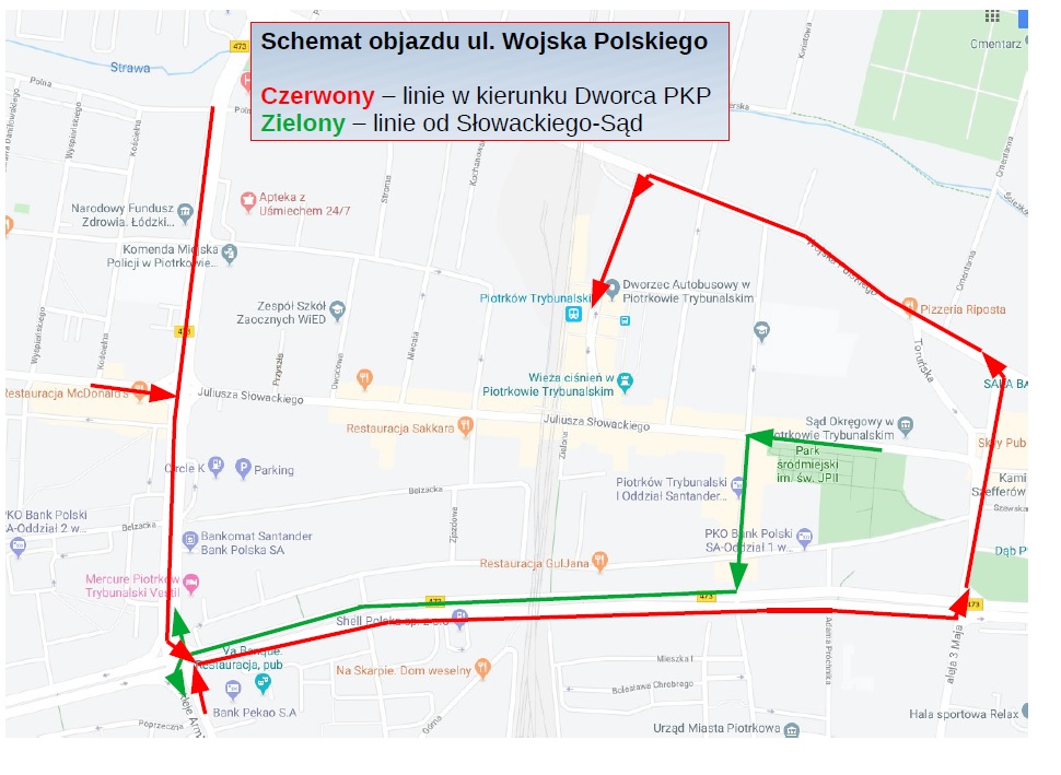 Wraz z rozpoczęciem przebudowy ulicy Wojska Polskiego – na odcinku od torów PKP do al. Armii Krajowej – wprowadzono tymczasową organizację ruchu piotrkowskich autobusów MZK, Życie pokazało jednak, że zaproponowane zmiany były co najmniej chybione. Autobusy stojąc w gigantycznych korkach spóźniały się notorycznie. Rekordziści przyjeżdżali na przystanki z 45-cio minutowym opóźnieniem, dlatego podjęto decyzję o zmianie trak autobusów objeżdżających zamknięty fragment Wojska Polskiego.