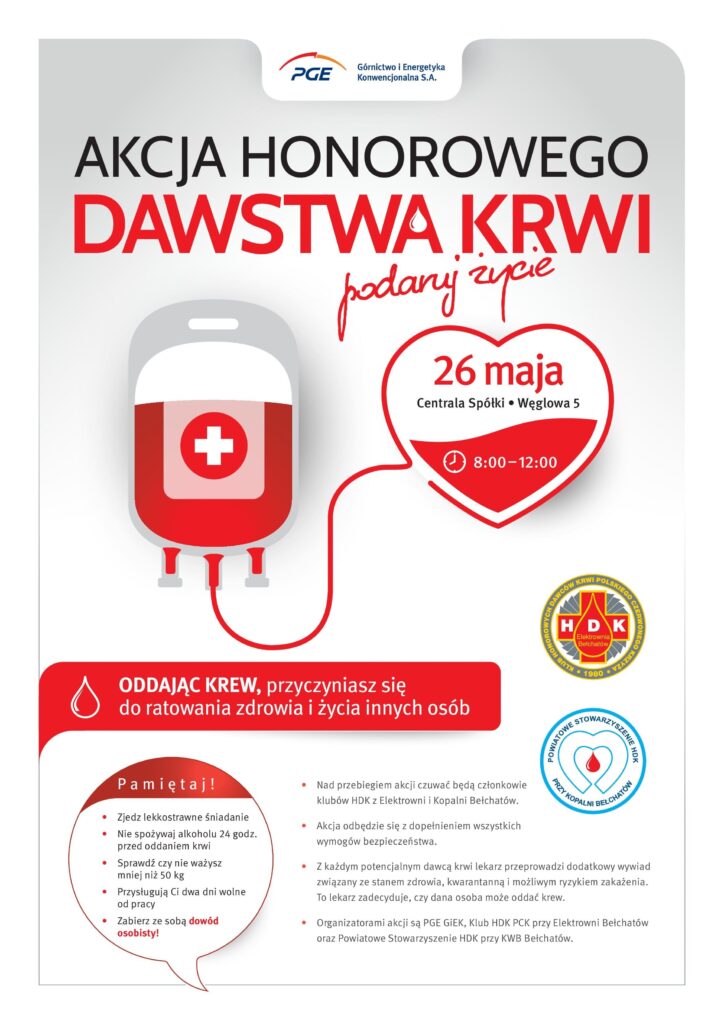 W najbliższy czwartek (26.5) w siedzibie Centrali spółki PGE Górnictwo i Energetyka Konwencjonalna przy ulicy Węglowej 5 w Bełchatowie, odbędzie się wspólna akcja oddawania krwi współorganizowana przez Klub Honorowych Dawców Krwi PCK działający przy Elektrowni Bełchatów, Powiatowe Stowarzyszenie HDK działające przy Kopalni Węgla Brunatnego Bełchatów oraz Centralę PGE GiEK.