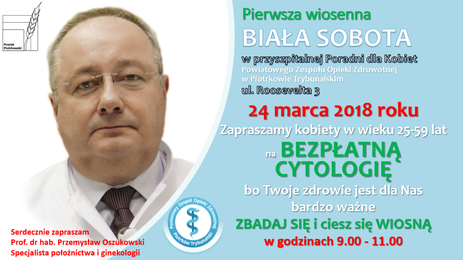 W Polsce każdego roku liczba kobiet z rozpoznaniem raka szyjki macicy wzrasta o blisko 4 tys. Niestety często jest to rak zaawansowany i wtedy trudno wygrać walkę o życie. Z myślą o mieszkankach miasta i powiatu piotrkowskiego, Powiatowy Zespół Opieki Zdrowotnej w Piotrkowie przeprowadzi bezpłatne badania cytologiczne. Szczególnie ważne jest to, aby cytologię wykonały panie w przedziale wiekowym 25-59 lat. Biała sobota już 24 marca w PZOZ ul. Roosevelta 3, w godzinach 9.00-11.00.