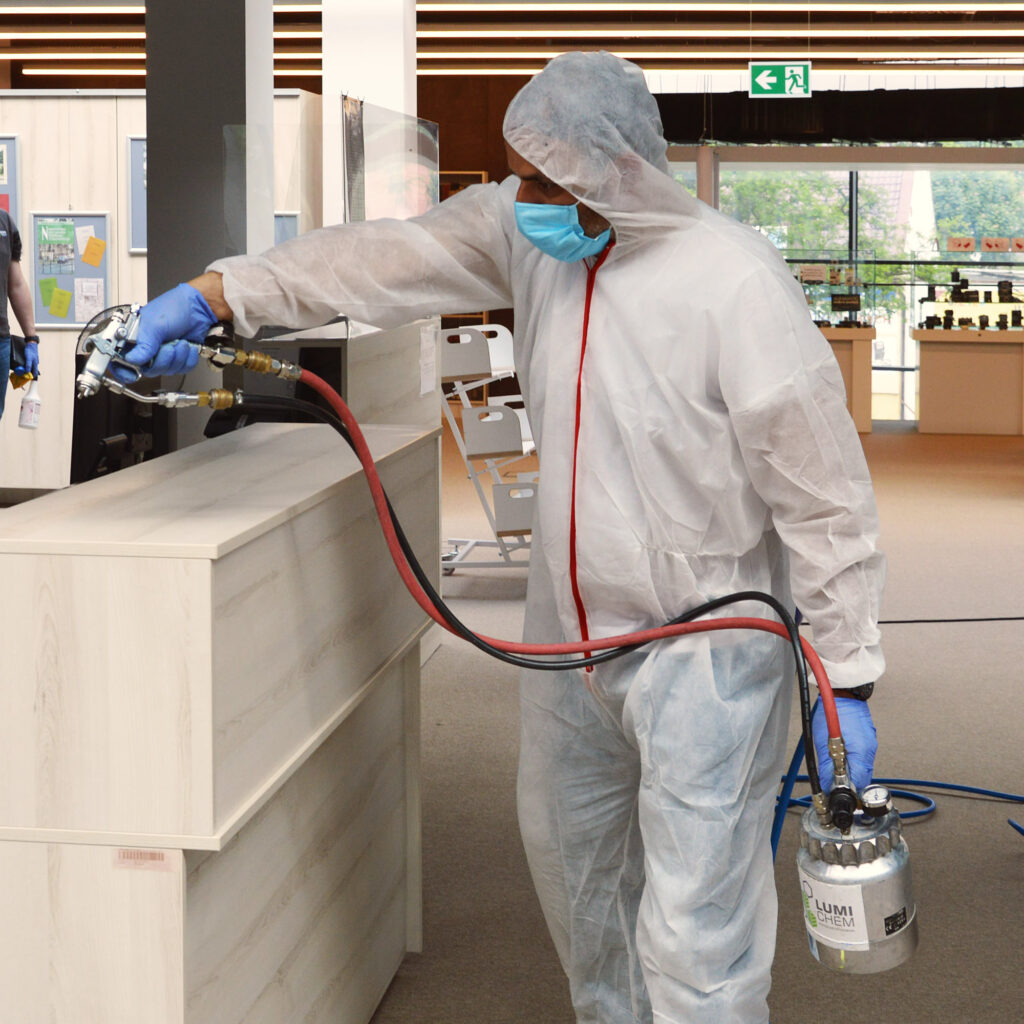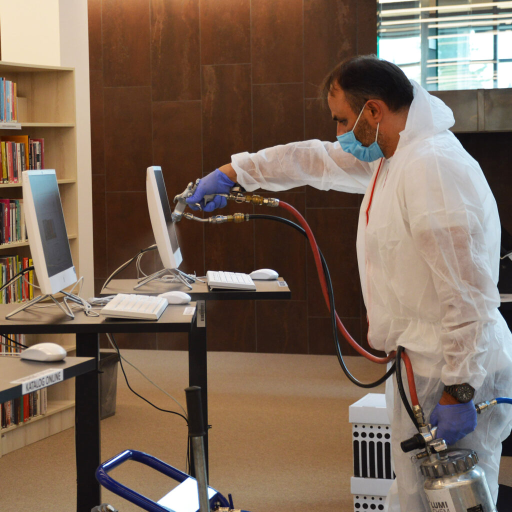 Nanodezynfekcji zostaną poddane lady w wypożyczalni i czytelni, self-checki, sanitariaty oraz wózki i koszyki, z których korzystać będą czytelnicy.