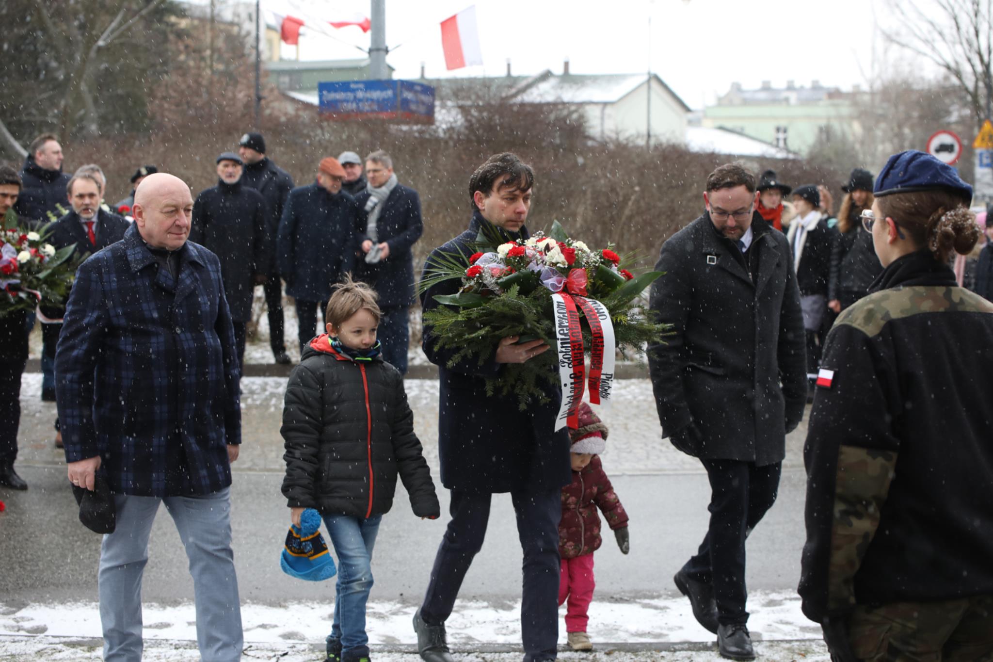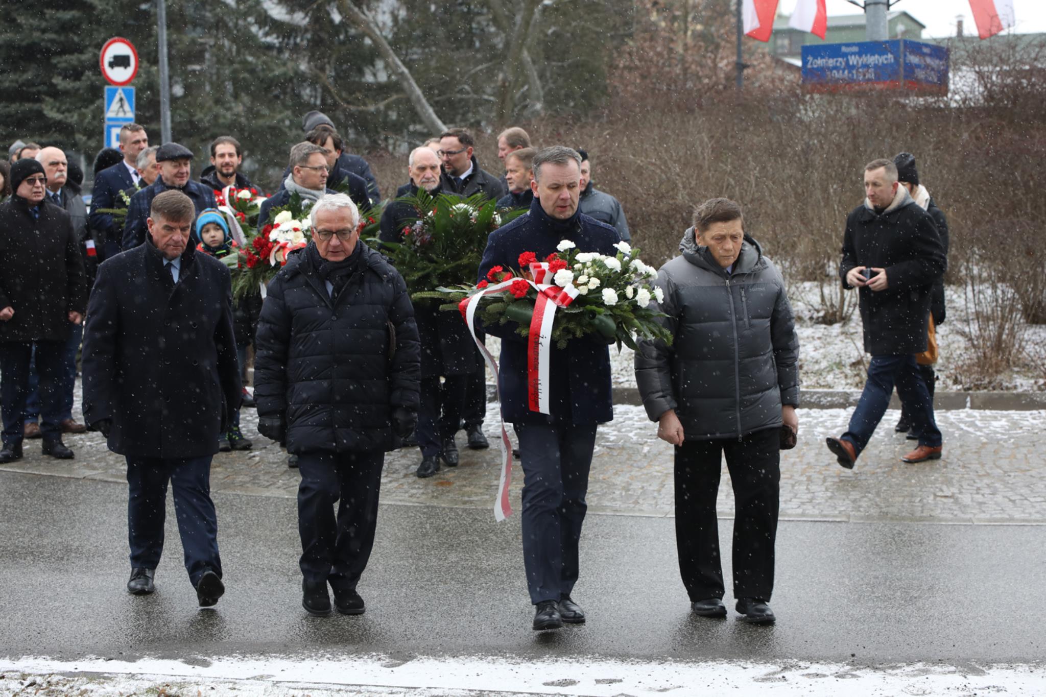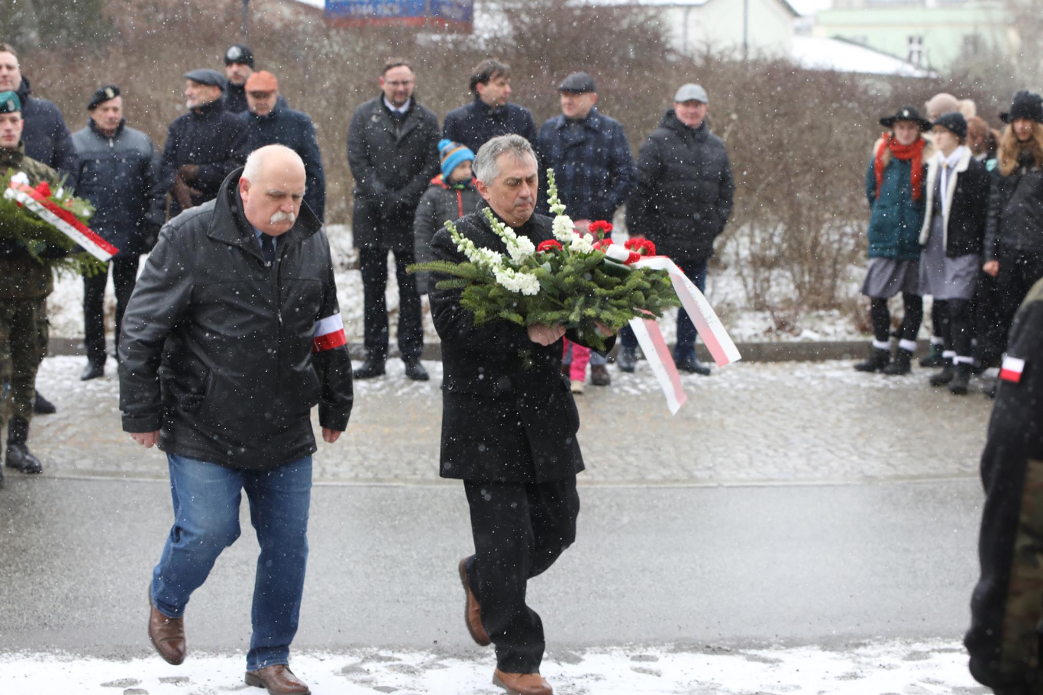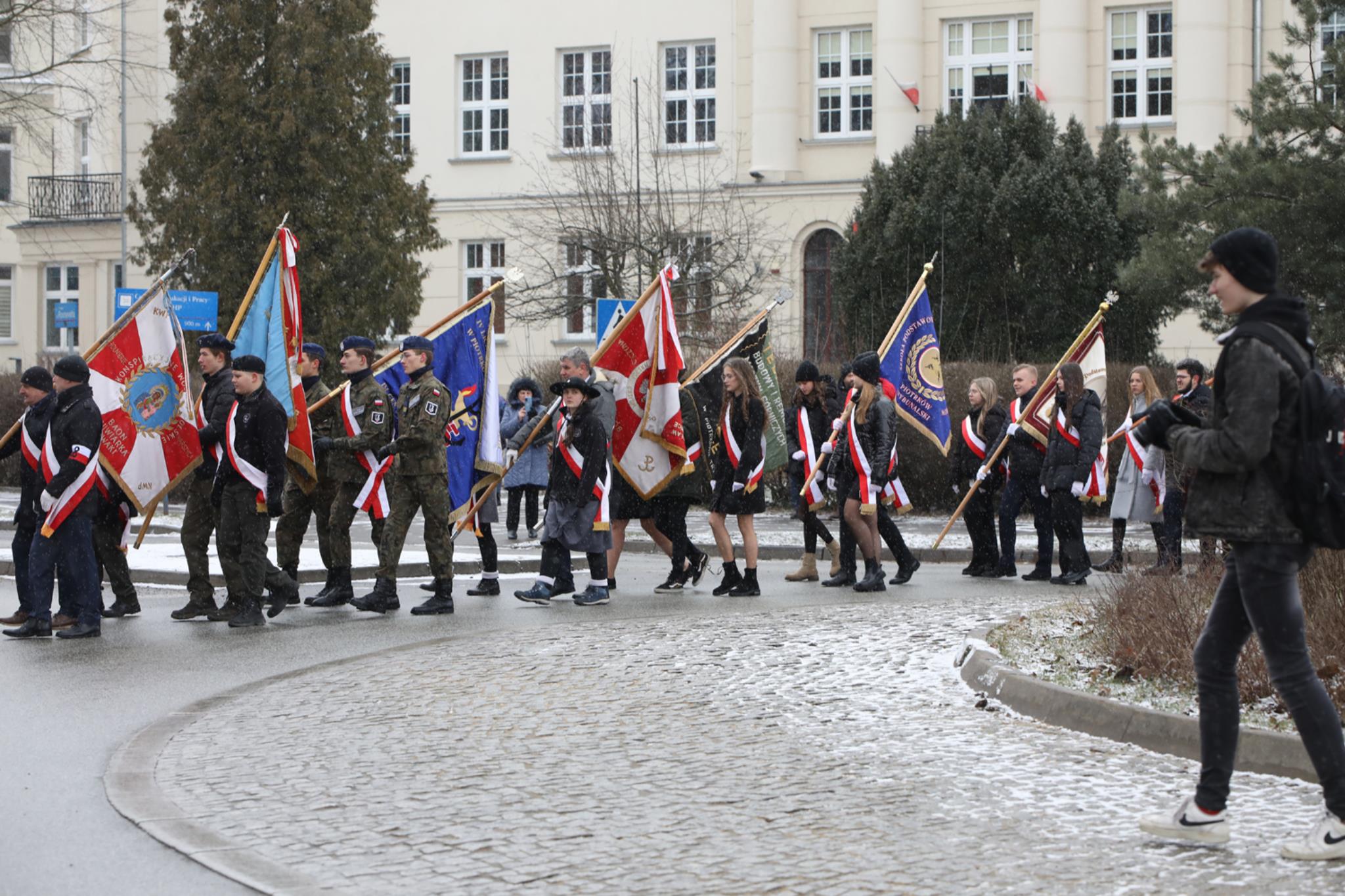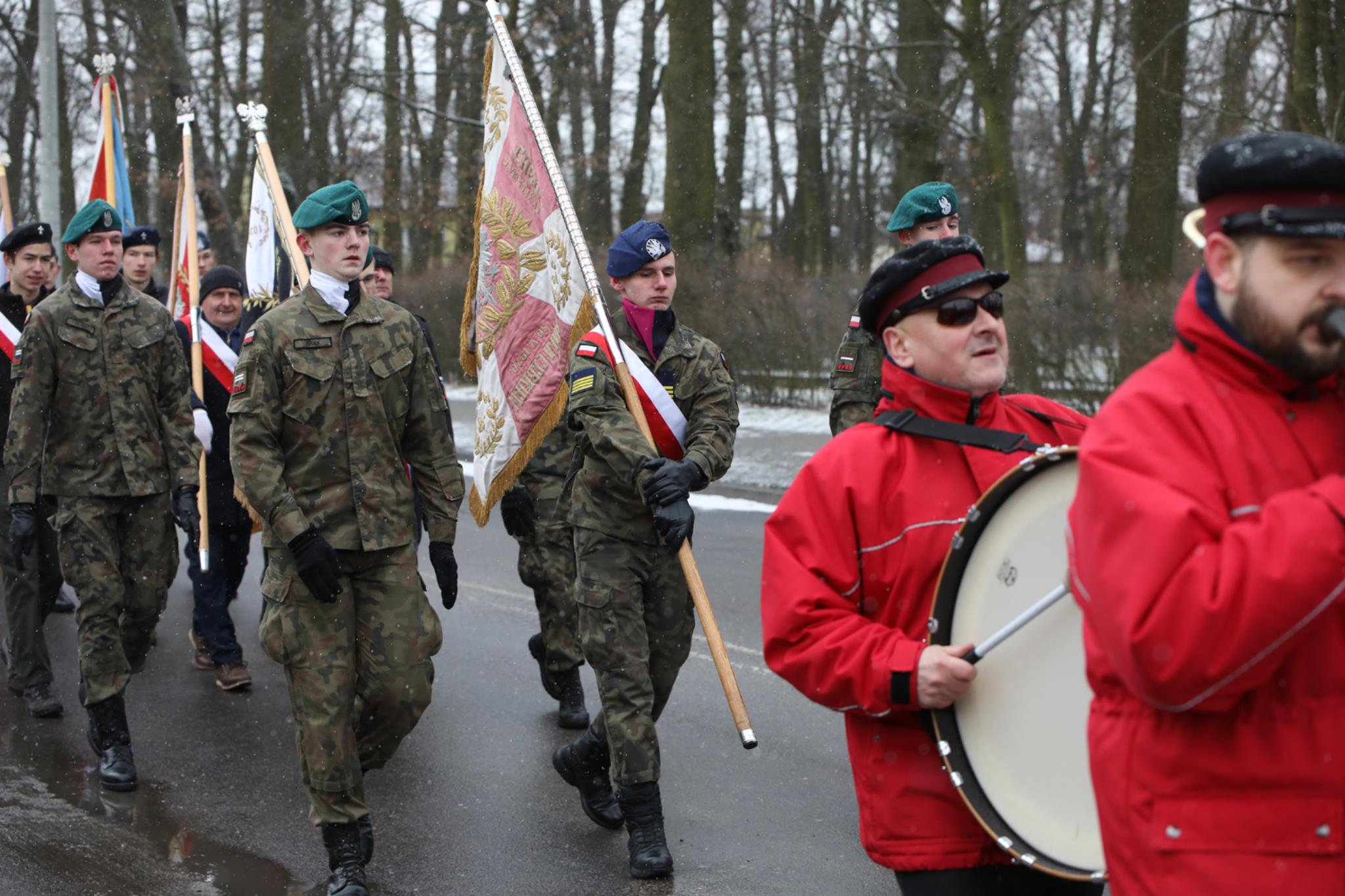Zanim jednak wystartował bieg miały miejsce oficjalne uroczystości, które zapoczątkowała msza święta odprawiona w kościele pw. Nawiedzenia Najświętszej Maryi Panny. Następnie zebrani wraz z pocztami sztandarowymi przemaszerowali, przy akompaniamencie Miejskiej Orkiestry Dętej, pod pomnik poświęcony Żołnierzom Wyklętym (u zbiegu ulic Roosevelta i Żeromskiego). Tutaj odśpiewano hymn państwowy, po czym delegacje złożyły kwiaty pod pomnikiem. (UM)