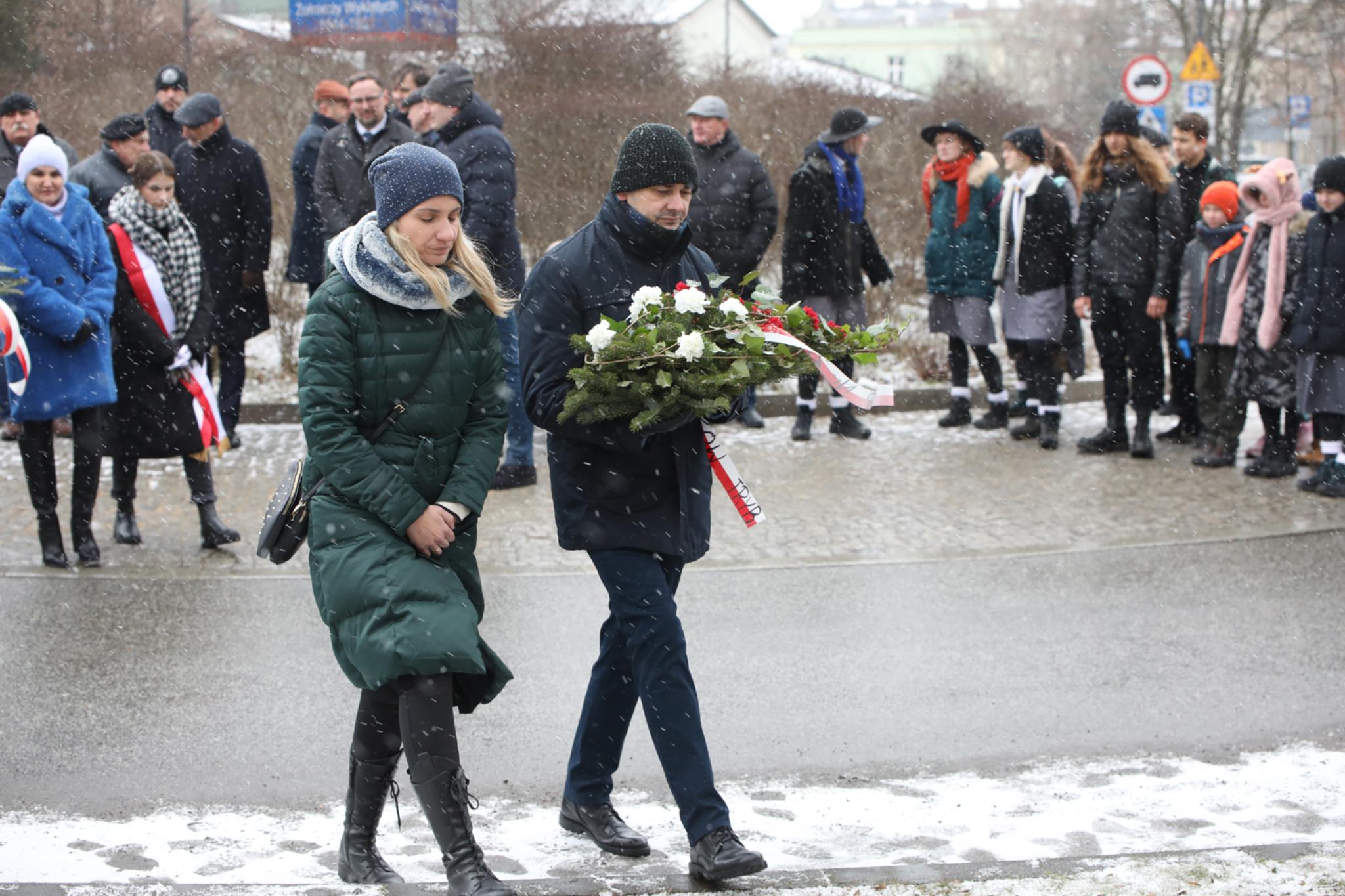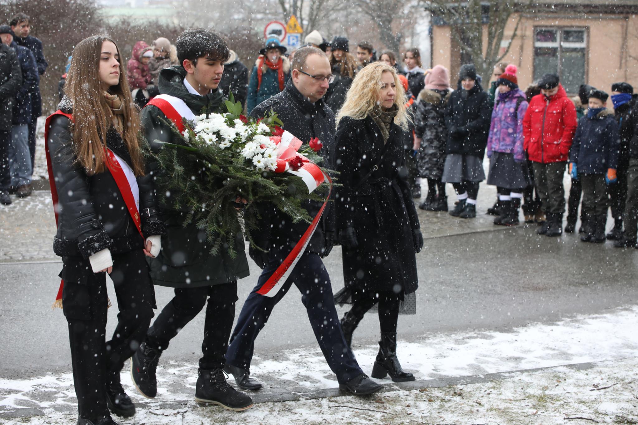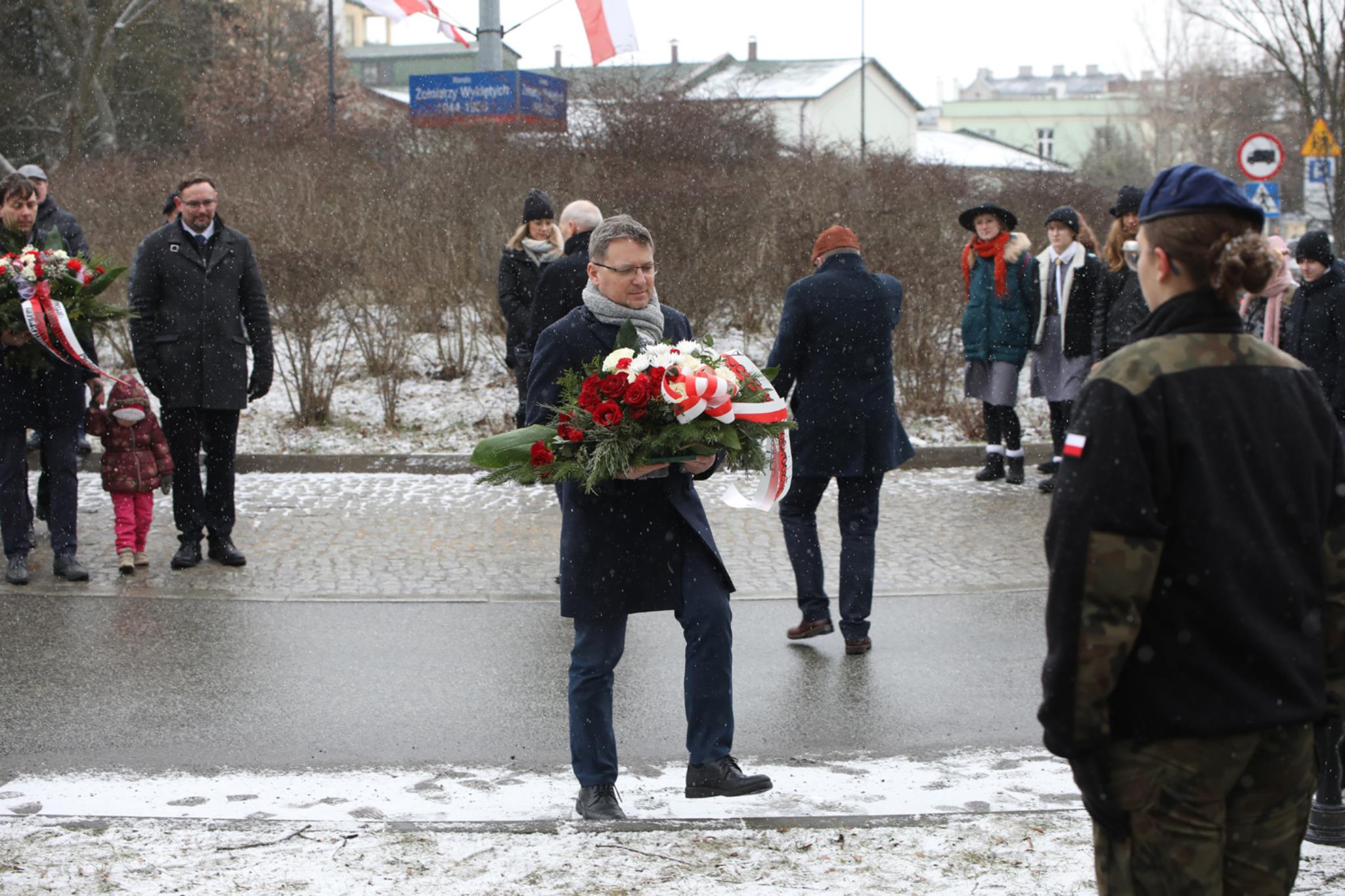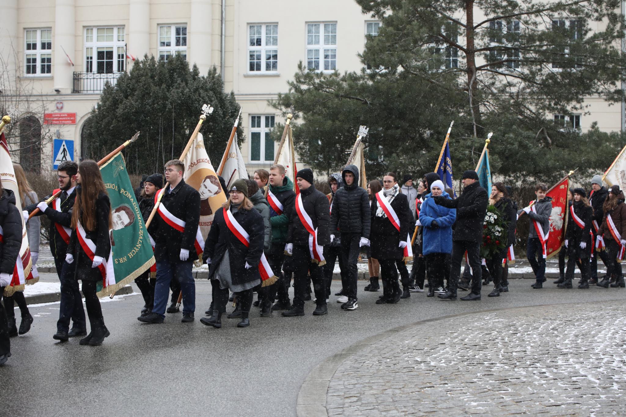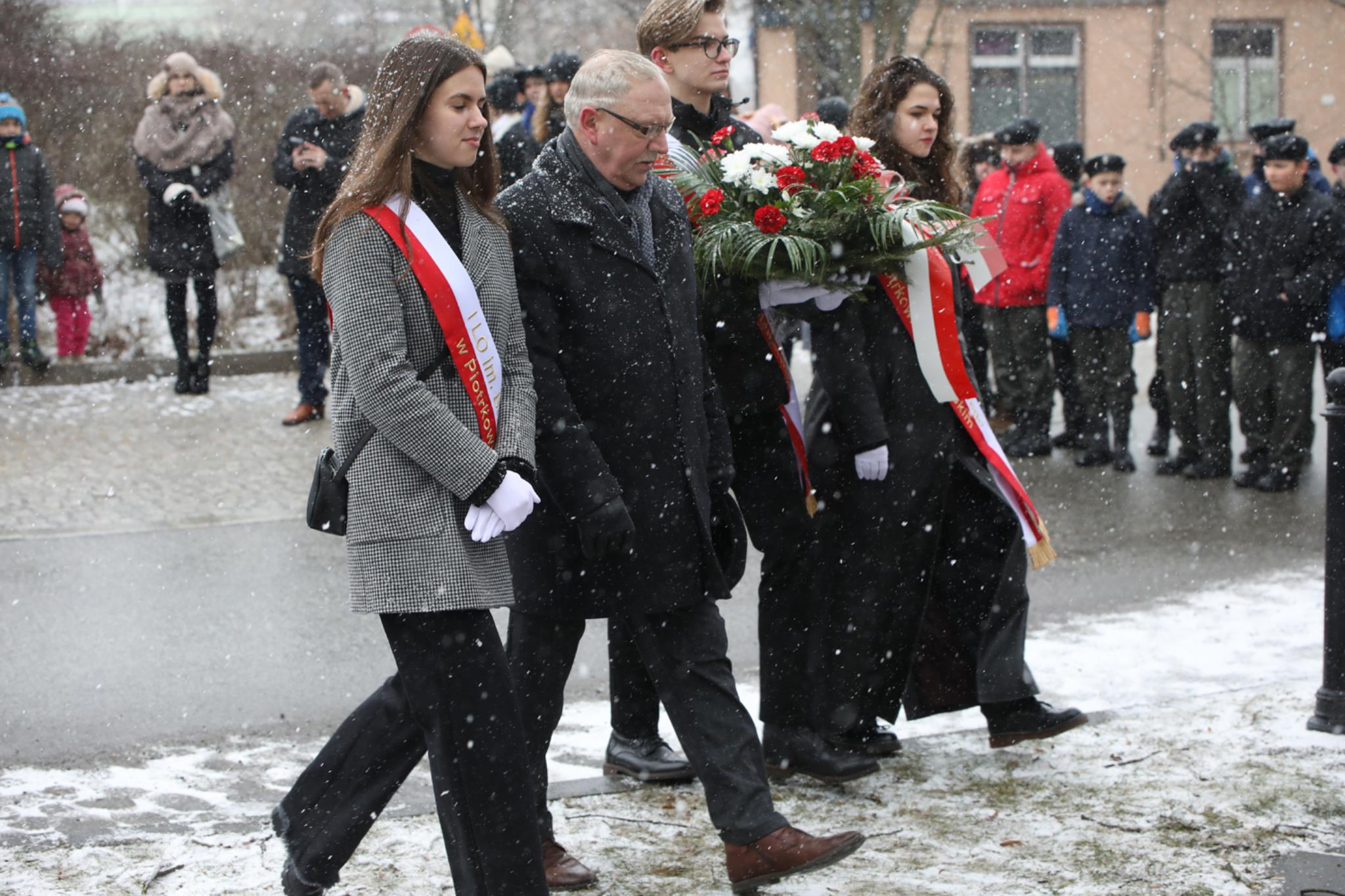 Zanim jednak wystartował bieg miały miejsce oficjalne uroczystości, które zapoczątkowała msza święta odprawiona w kościele pw. Nawiedzenia Najświętszej Maryi Panny. Następnie zebrani wraz z pocztami sztandarowymi przemaszerowali, przy akompaniamencie Miejskiej Orkiestry Dętej, pod pomnik poświęcony Żołnierzom Wyklętym (u zbiegu ulic Roosevelta i Żeromskiego). Tutaj odśpiewano hymn państwowy, po czym delegacje złożyły kwiaty pod pomnikiem. (UM)