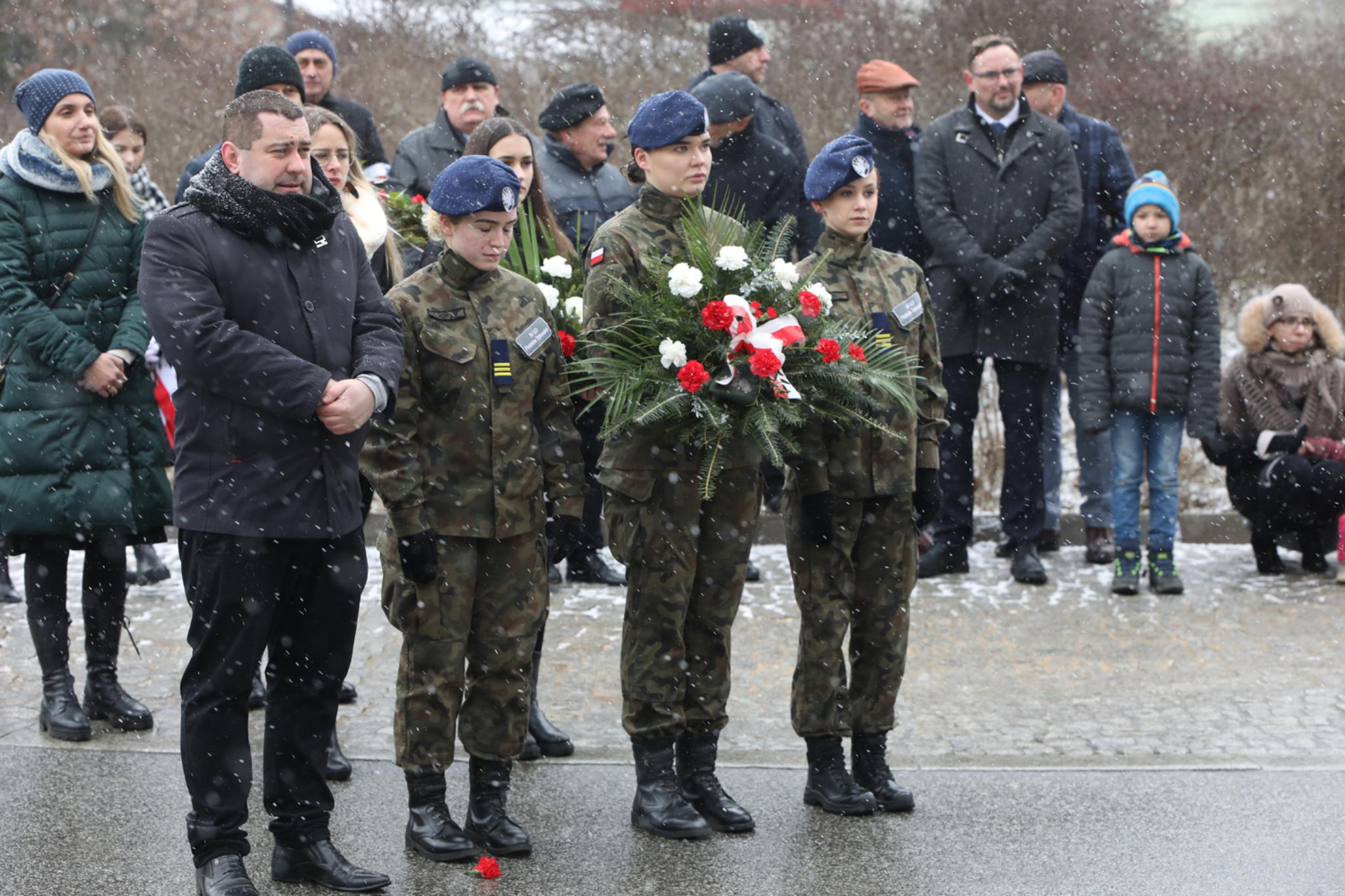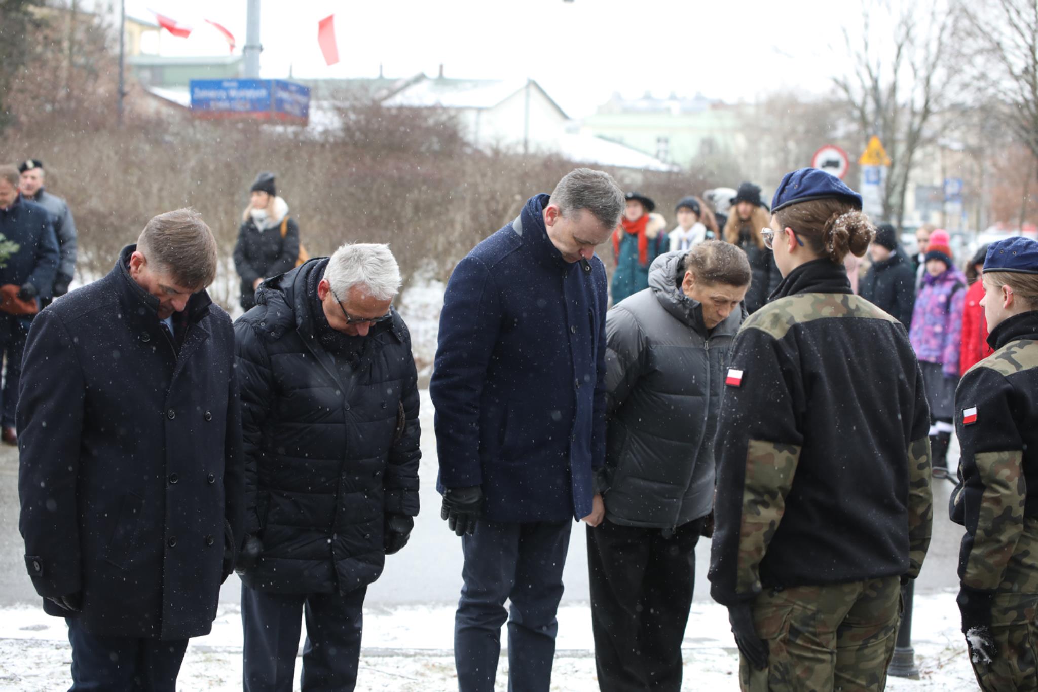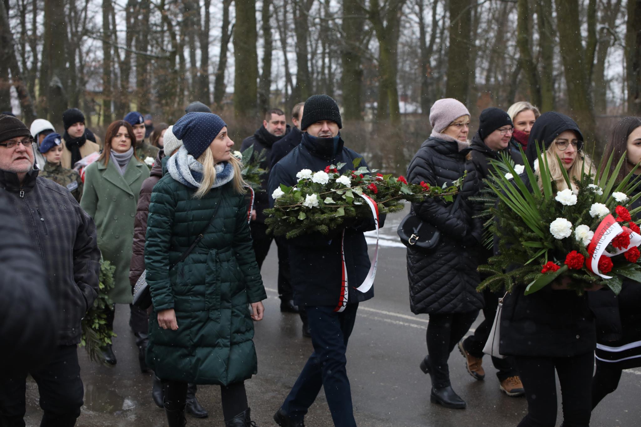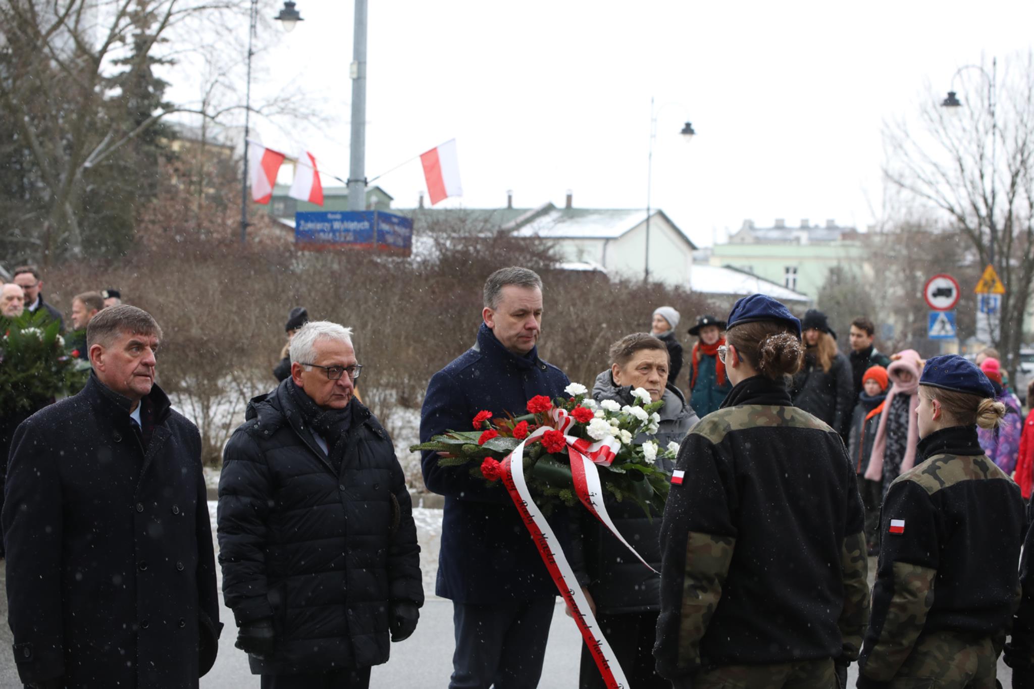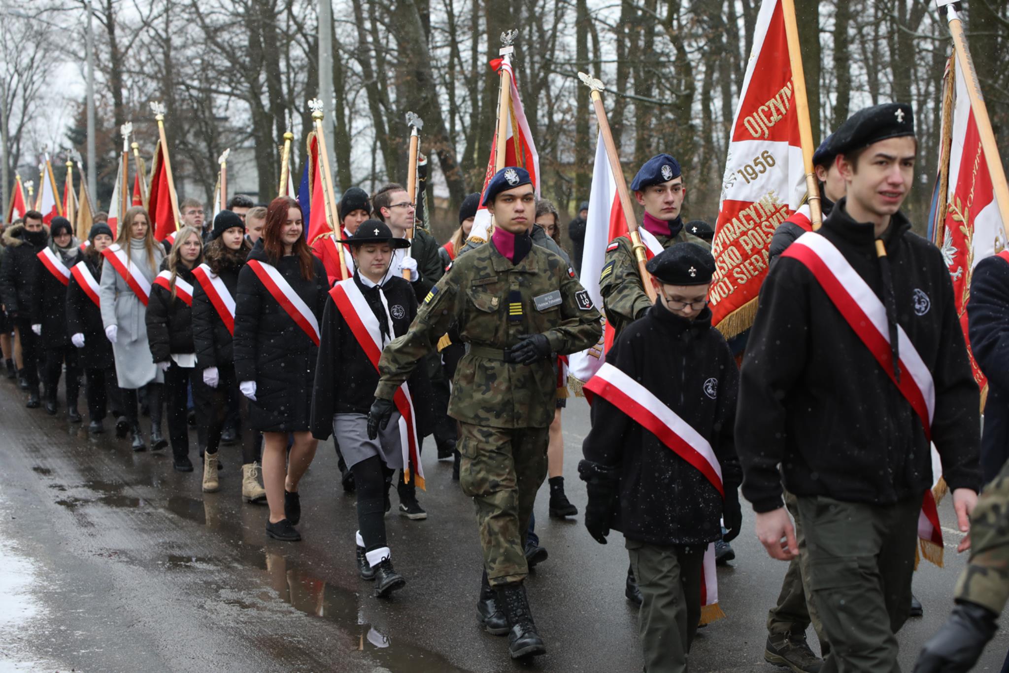 Zanim jednak wystartował bieg miały miejsce oficjalne uroczystości, które zapoczątkowała msza święta odprawiona w kościele pw. Nawiedzenia Najświętszej Maryi Panny. Następnie zebrani wraz z pocztami sztandarowymi przemaszerowali, przy akompaniamencie Miejskiej Orkiestry Dętej, pod pomnik poświęcony Żołnierzom Wyklętym (u zbiegu ulic Roosevelta i Żeromskiego). Tutaj odśpiewano hymn państwowy, po czym delegacje złożyły kwiaty pod pomnikiem. (UM)