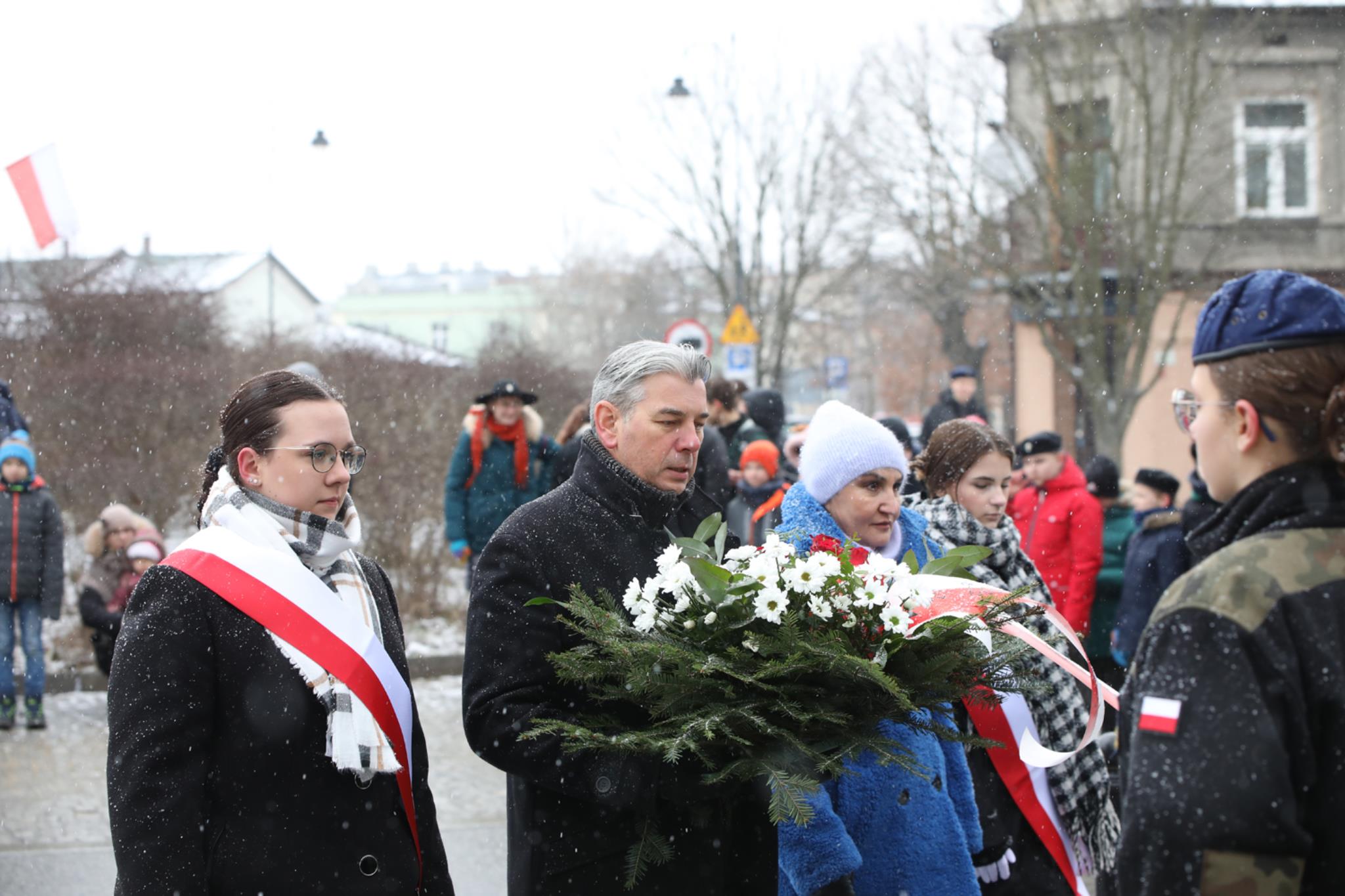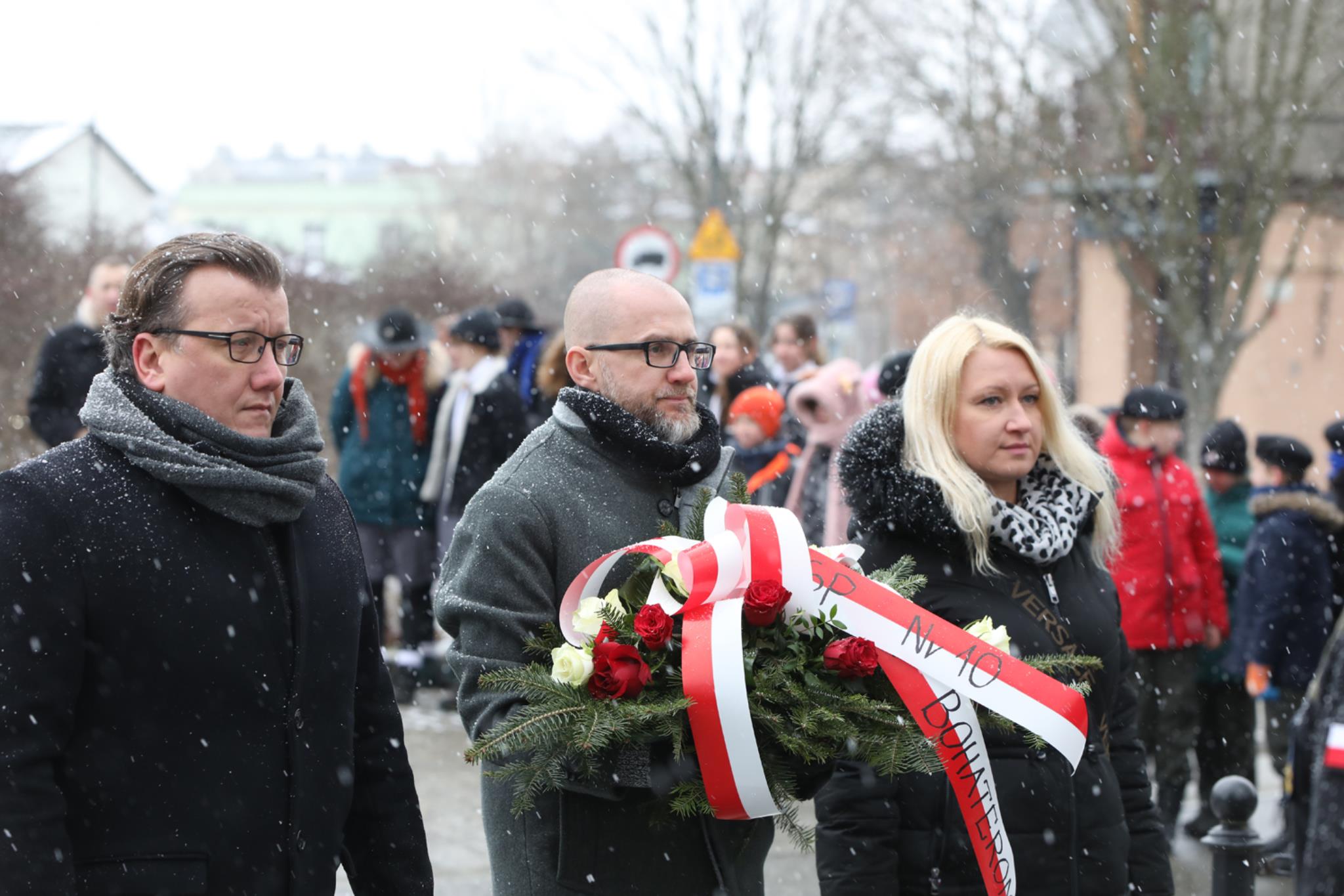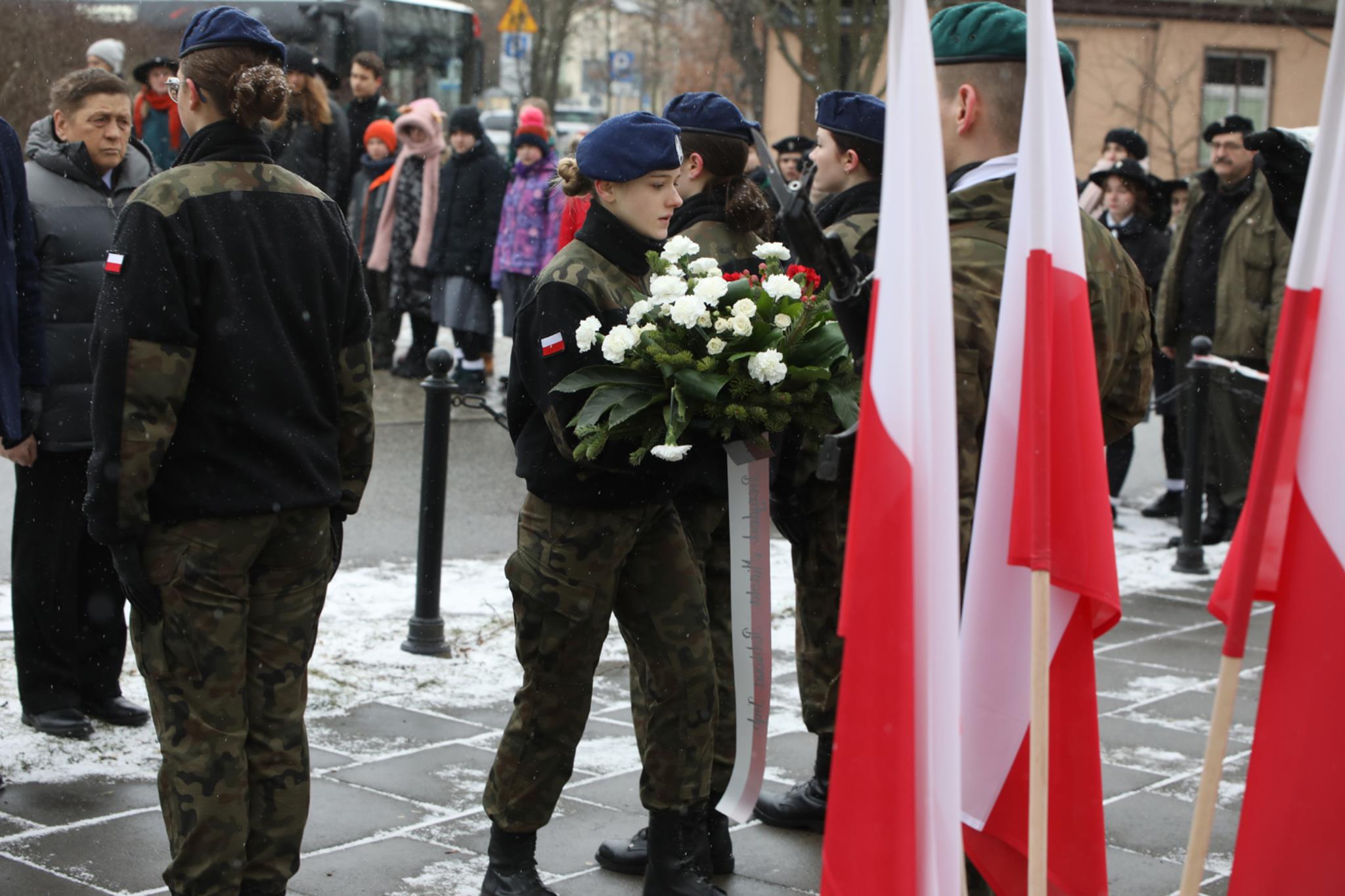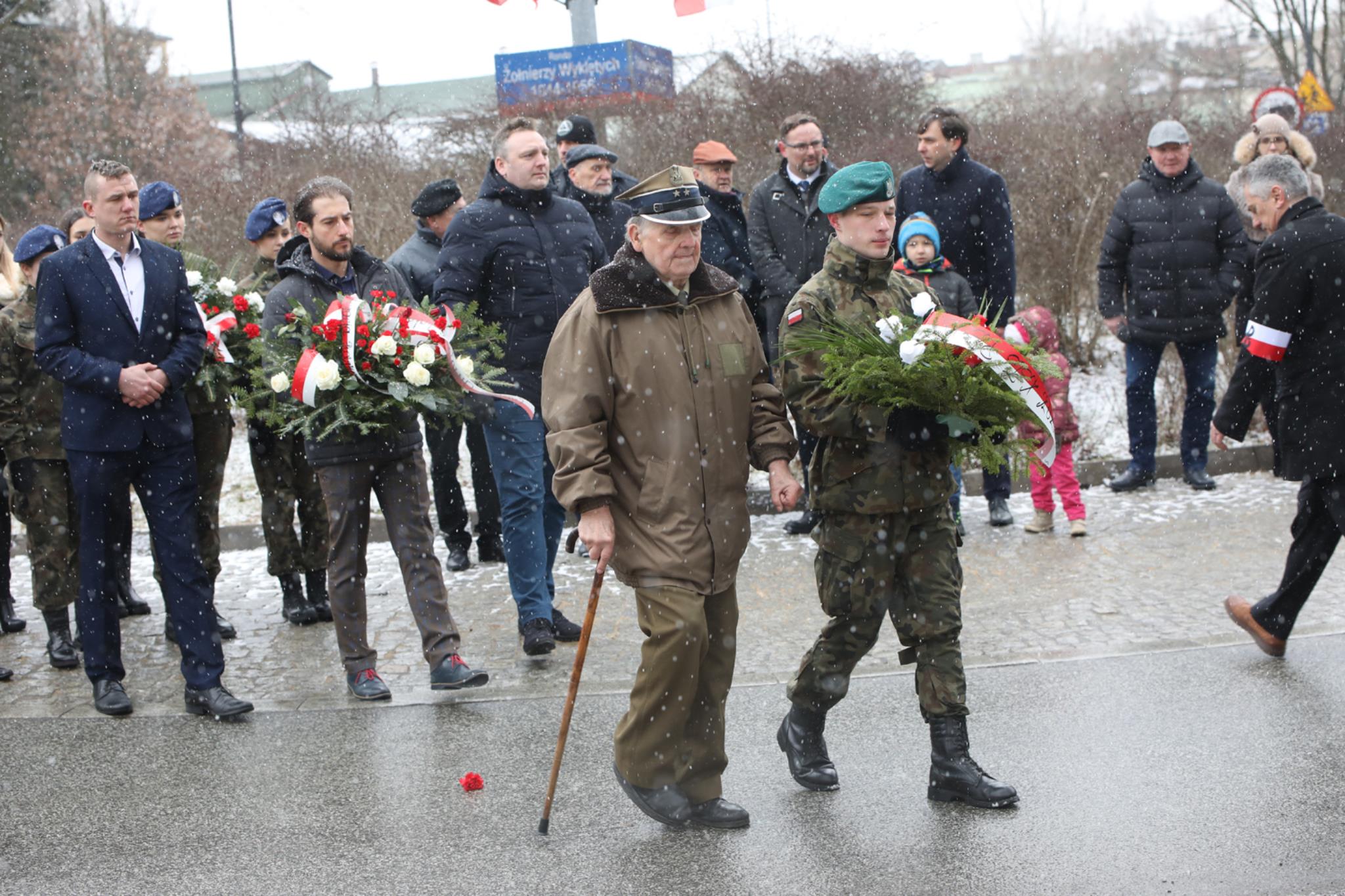 Zanim jednak wystartował bieg miały miejsce oficjalne uroczystości, które zapoczątkowała msza święta odprawiona w kościele pw. Nawiedzenia Najświętszej Maryi Panny. Następnie zebrani wraz z pocztami sztandarowymi przemaszerowali, przy akompaniamencie Miejskiej Orkiestry Dętej, pod pomnik poświęcony Żołnierzom Wyklętym (u zbiegu ulic Roosevelta i Żeromskiego). Tutaj odśpiewano hymn państwowy, po czym delegacje złożyły kwiaty pod pomnikiem. (UM)