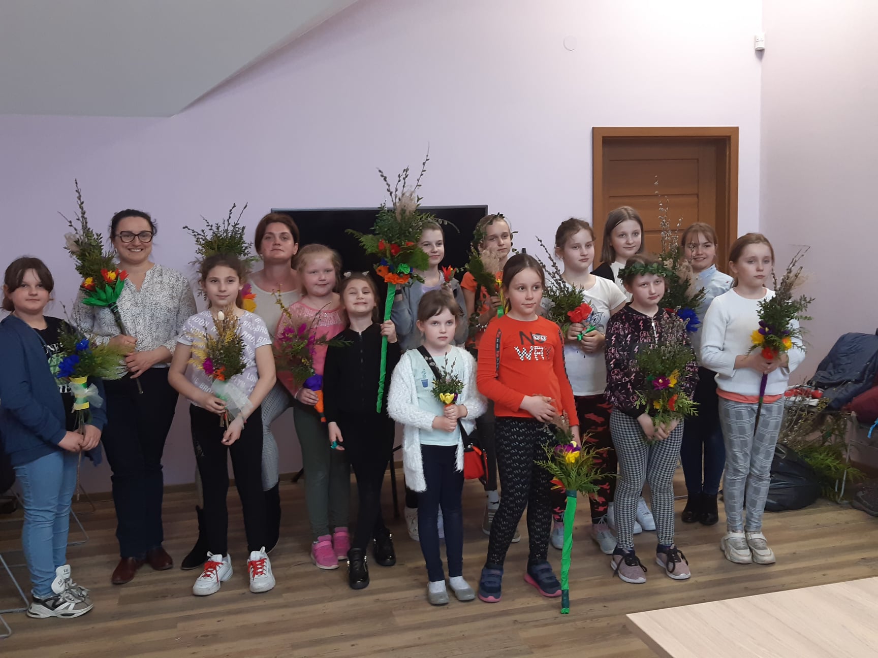 – W ten dzień zanosimy palemki do kościoła i je święcimy. Poświęcona palemka miała magiczne właściwości, dlatego zanoszono ją do domu, by zapewniała rodzinie szczęście. Nasze dzieci z zespołu bardzo angażowały się w robienie palemek, zbierały gałązki wierzby bazie kotki, bukszpan, gałązki drzewek iglastych, suszyły kwiaty. Takie manualne zajęcia rozwijają kreatywność dziecka, a także są znakomitą okazją do wspólnego spędzenia czasu oraz integracji przy dźwiękach akordeonu. – mówi Anna Wiśniewska, instruktorka zespołu Choberki.