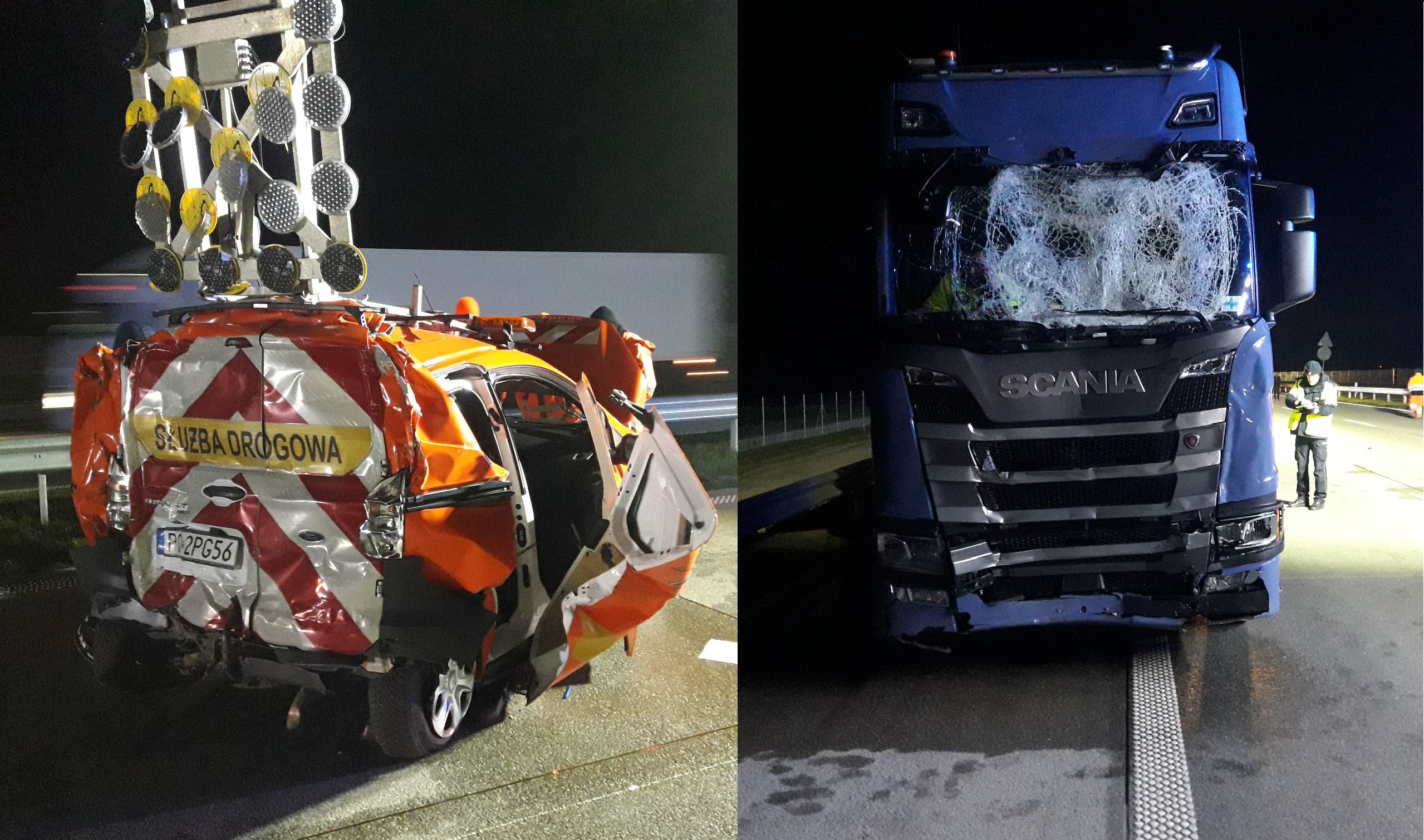 Do wypadku doszło tuż przed 1 w nocy na pasie w kierunku Piotrkowa i Łodzi. Pracownicy służby drogowej sprzątali autostradę po tym, jak w jednej z ciężarówek wystrzeliła opona i kilku kierowców uszkodziło swoje pojazdy najeżdżając na elementy koła. W pewnym momencie na oznakowany pojazd służby drogowej, najechał kierujący scanią z lawetą. O dużym szczęściu może mówić jeden z pracowników służby autostradowej. Mężczyzna został uderzony przez pojazd, na który najechała ciężarówka i ma złamaną nogę. 34-letni kierowca ciężarówki był trzeźwy.