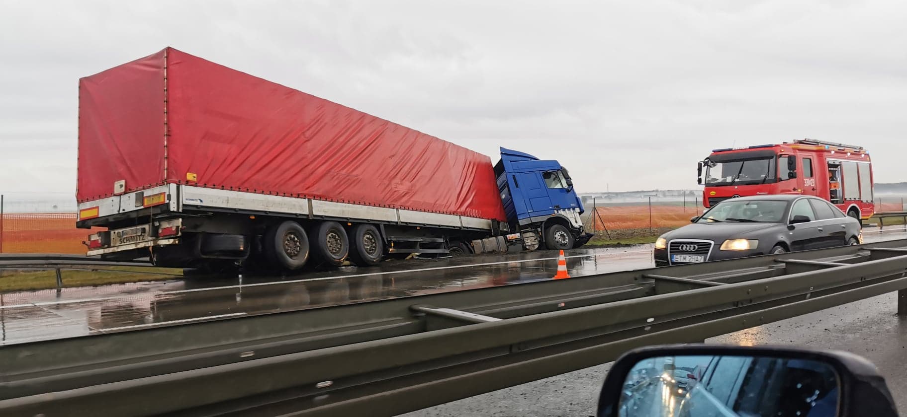 Jadący w stronę Warszawy kierowca ciężarówki z naczepą, nie dostosował prędkości do panujących warunków na drodze, uderzył w bariery i wjechał do rowu. Na szczęście nikomu nic się nie stało. Przybyli na miejsce policjanci, zakwalifikowali zdarzenie jako kolizję drogową i nałożyli na kierującego mandat.