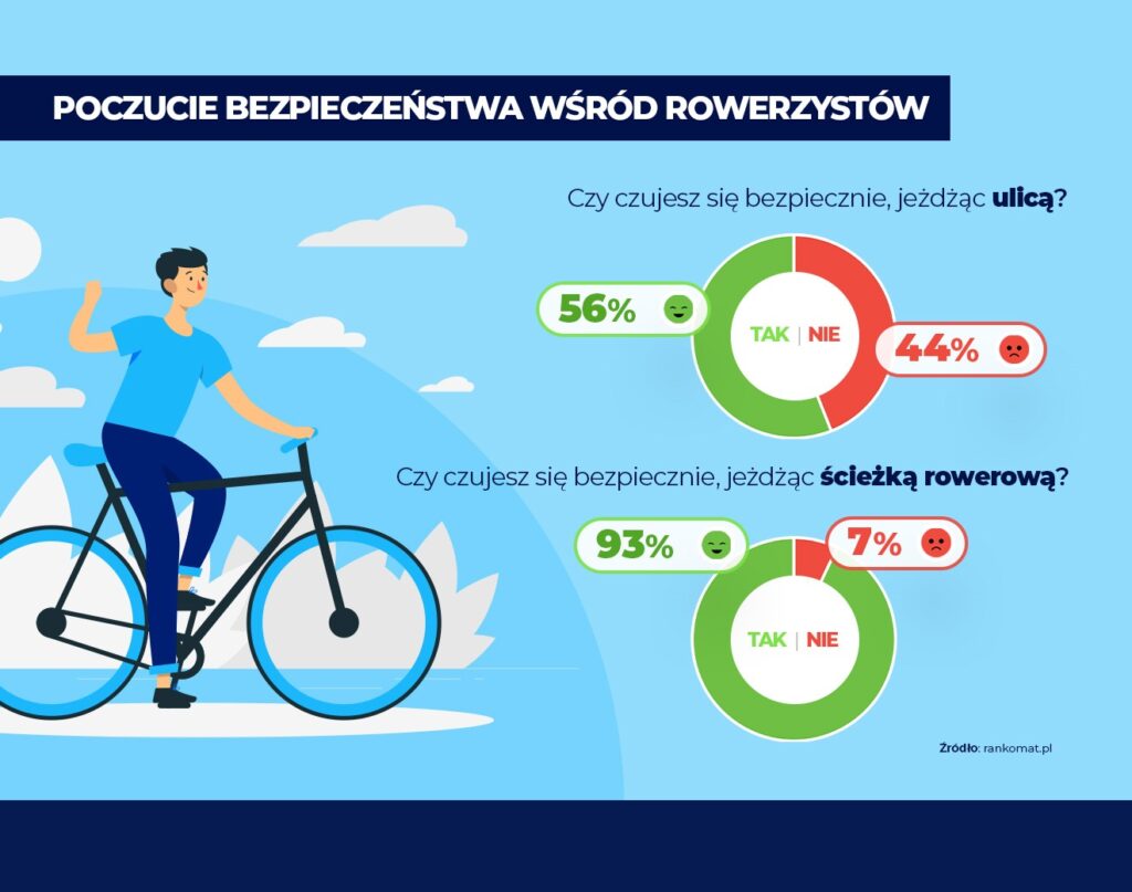Tylko 56 proc. rowerzystów czuje się bezpiecznie podczas jazdy po ulicy razem z samochodami – wynika z badania przeprowadzonego na zlecenie multiporównywarki rankomat.pl. Mimo to jazda rowerem staje się z roku na rok coraz bezpieczniejsza. Powodem jest boom na budowę ścieżek rowerowych. Na nich bezpiecznie czuje się aż 93 proc. badanych.