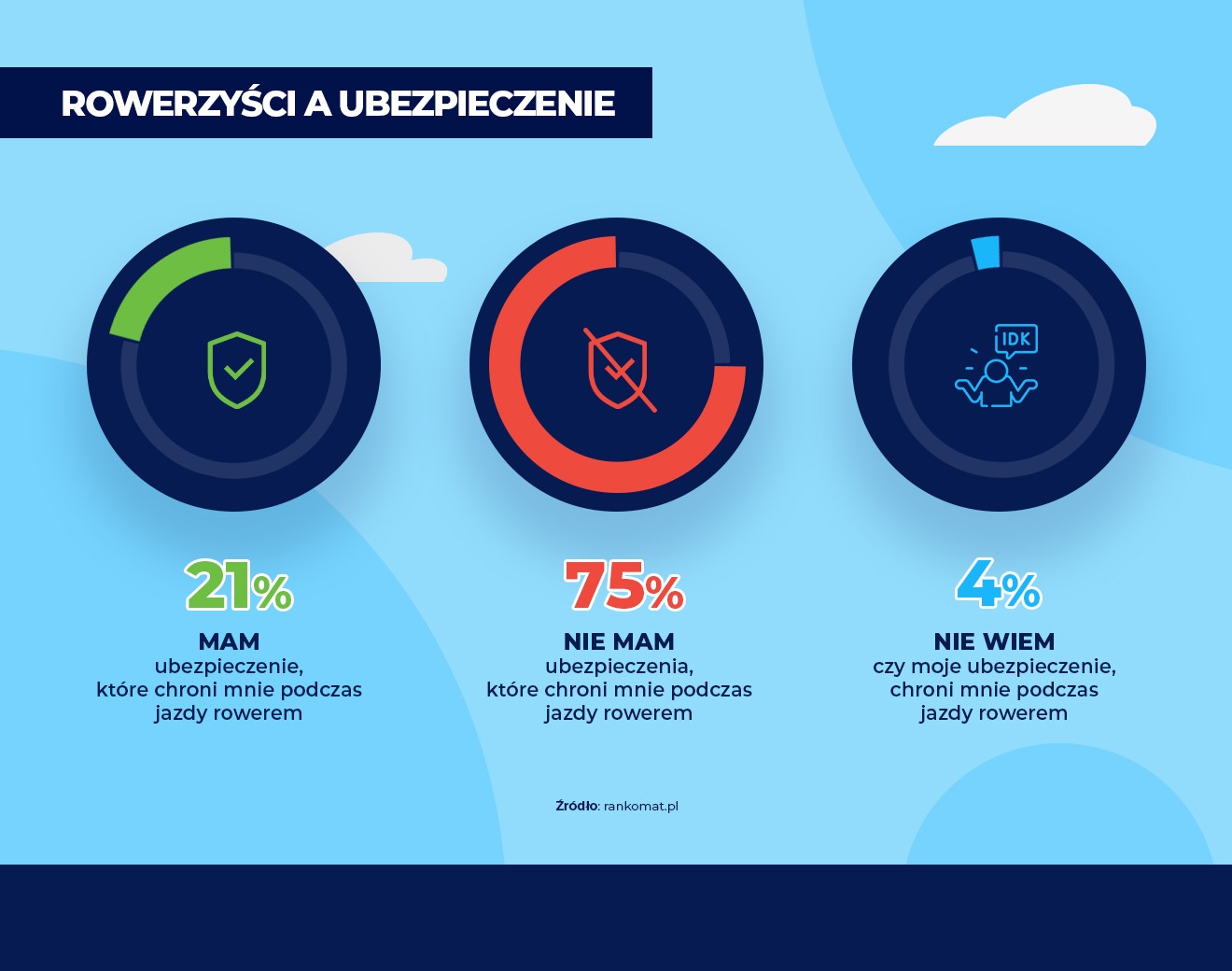 Rankomat.pl sprawdził także podejście rowerzystów do ubezpieczeń. Jak wynika z badania, co piąty miłośnik dwóch kółek (21 proc.) posiada polisę, która chroni jego lub jego rower podczas jazdy. Aż 75 proc. badanych deklaruje, że nie posiada ubezpieczenia, które obejmuje zdarzenia związane z jazdą na rowerze. Wśród respondentów znalazła się też grupa, która posiada ubezpieczenie, ale nie ma wiedzy, czy polisa ochroni ich w tym określonym przypadku – to 4 proc. badanych.