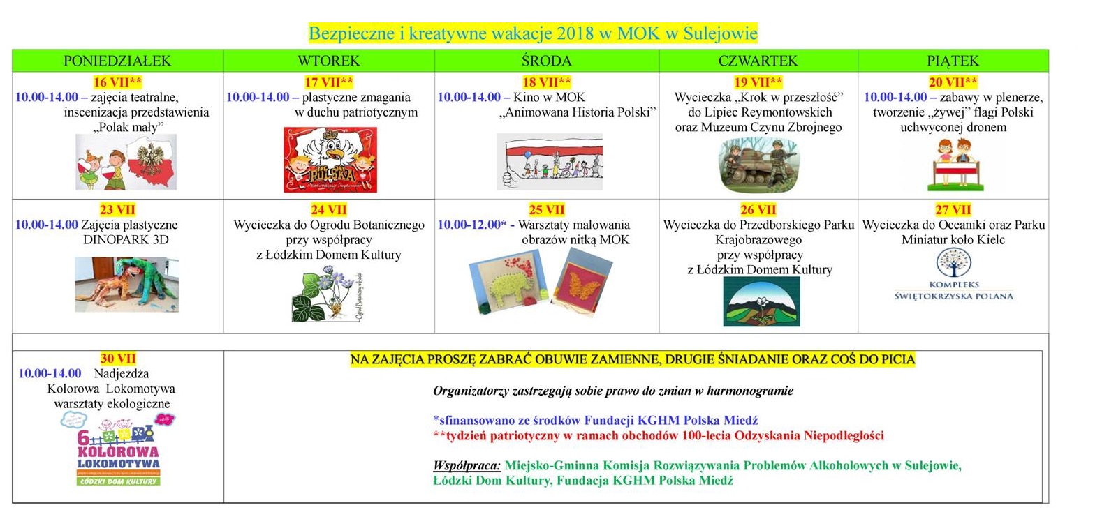 „Bezpieczne i kreatywne wakacje 2018”, pod takim hasłem przez cały lipiec odbywają się zajęcia dla dzieci, które nie wyjechały na wakacje. Oferta jest tak przygotowana, że na pewno każdy najmłodszy mieszkaniec gminy Sulejów znajdzie coś dla siebie.